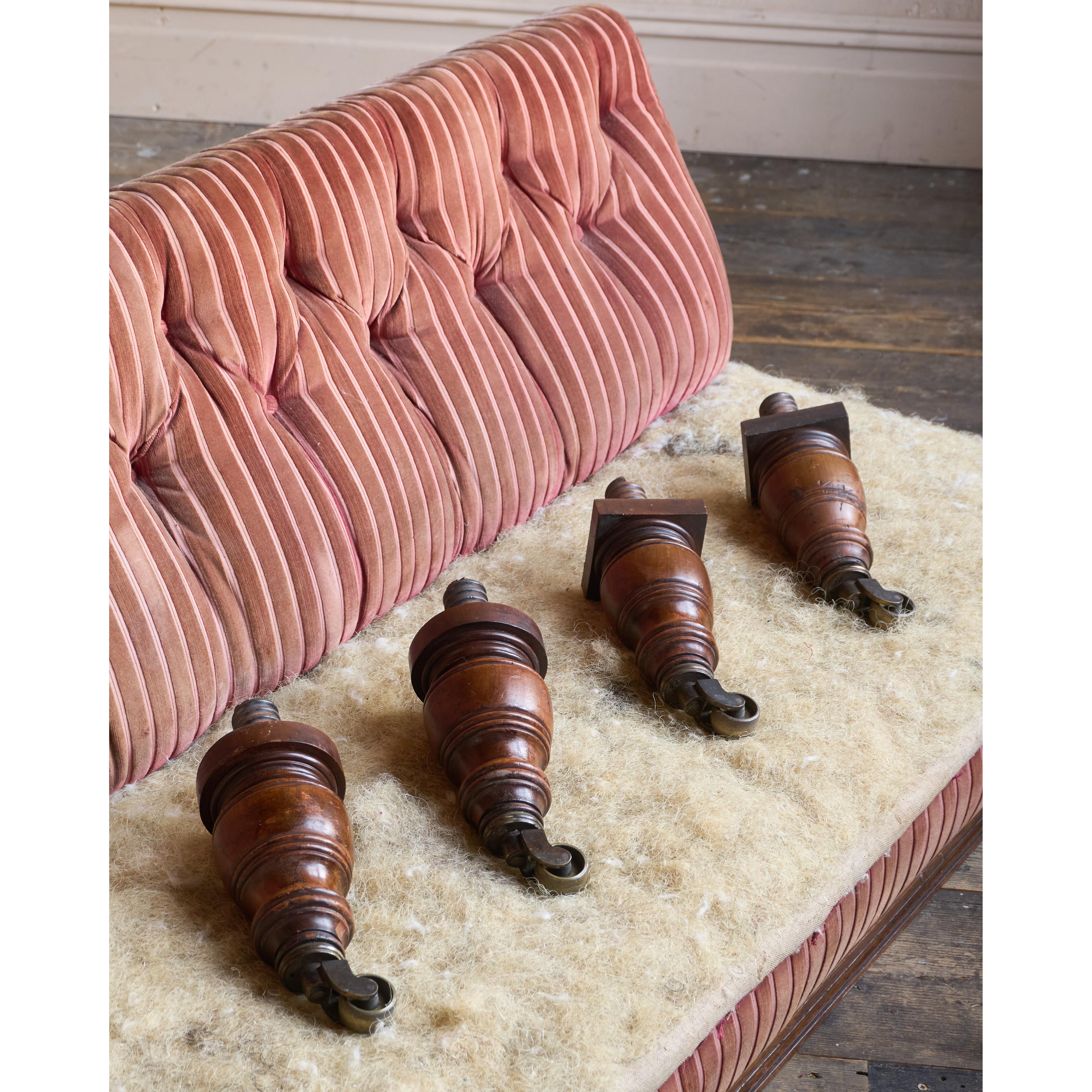 The back is buttoned, and the seat sits within a timber frame raised on solid oak legs. Each leg is fitted with a wooden screw thread at the top, allowing them to be removed for transport, a practical feature typical of campaign furniture.