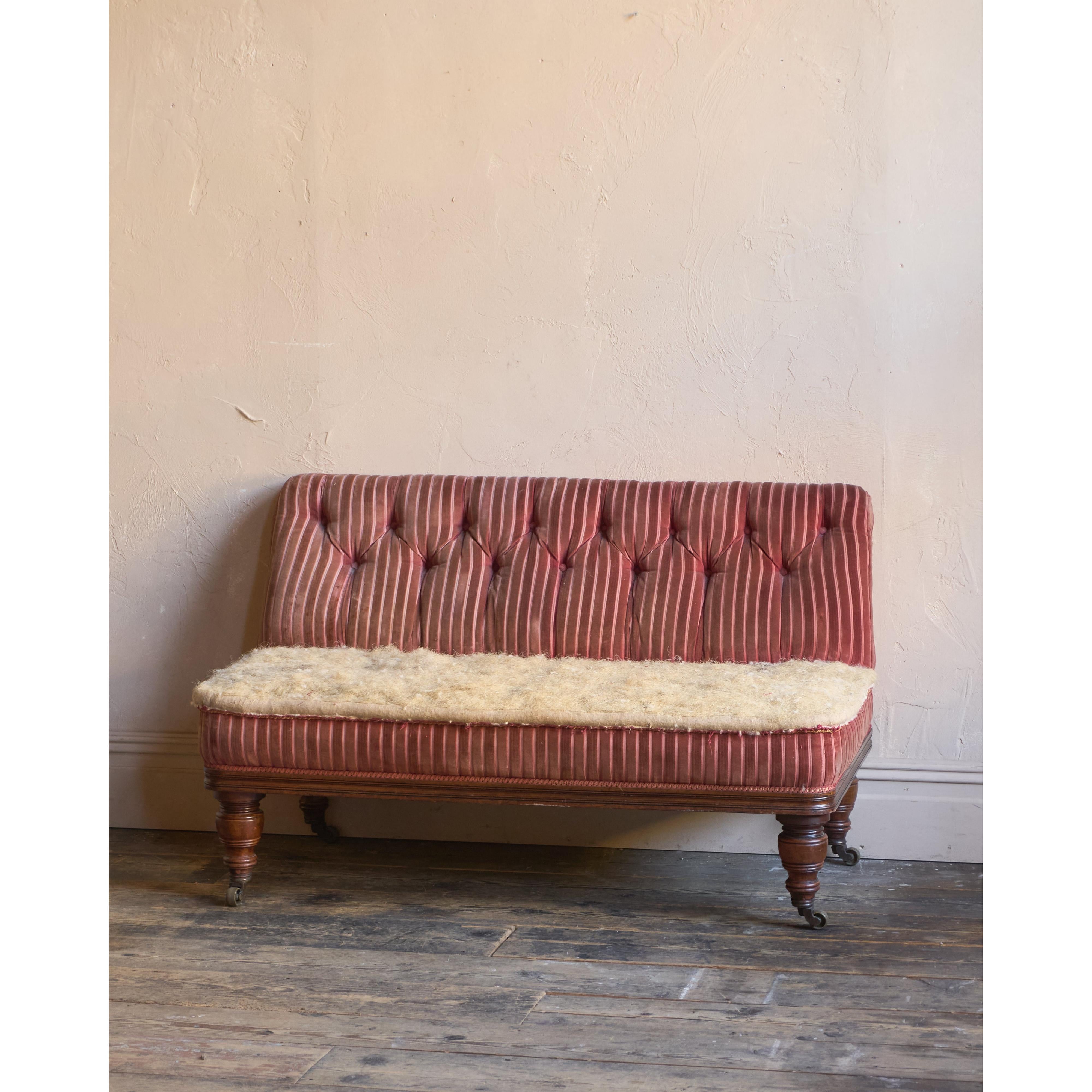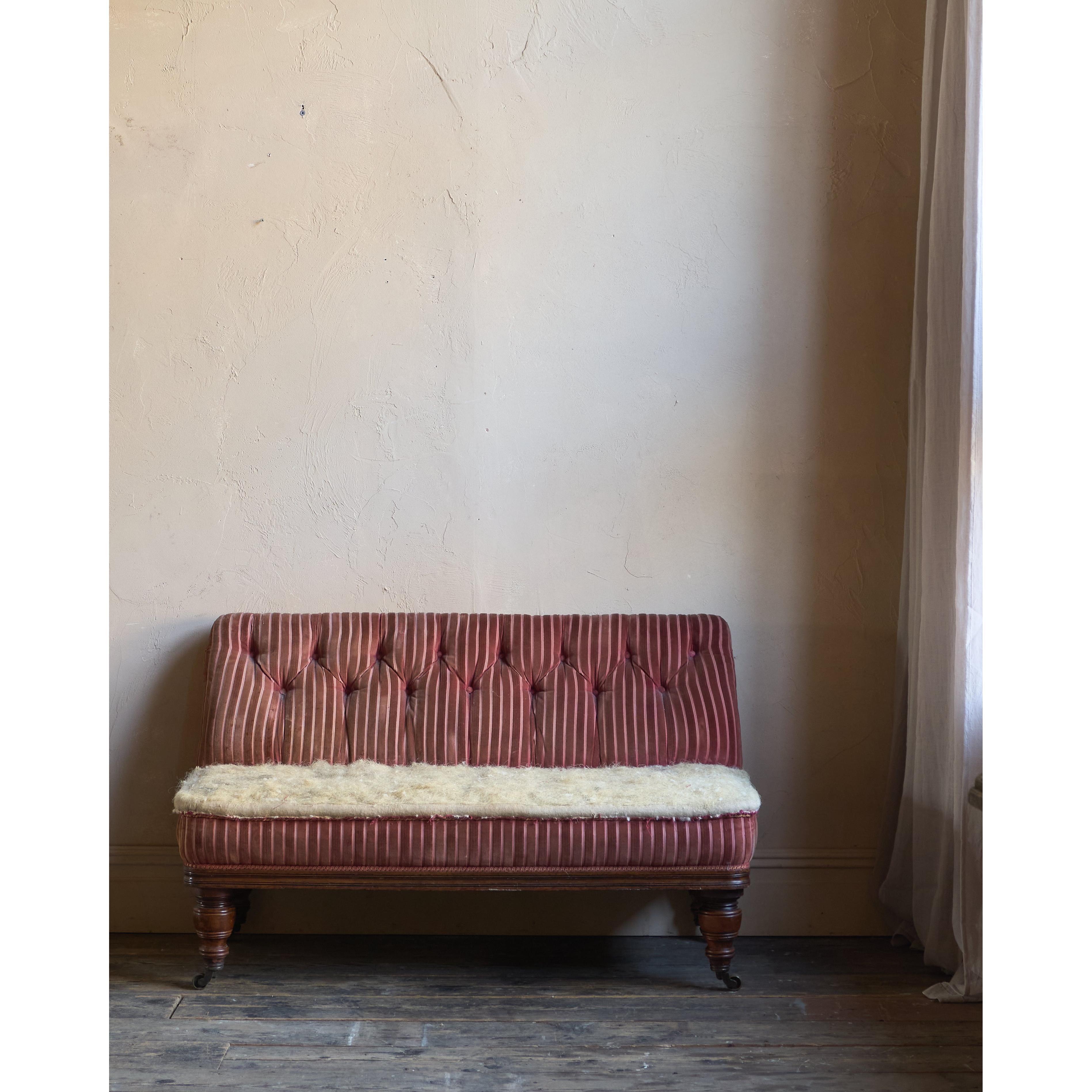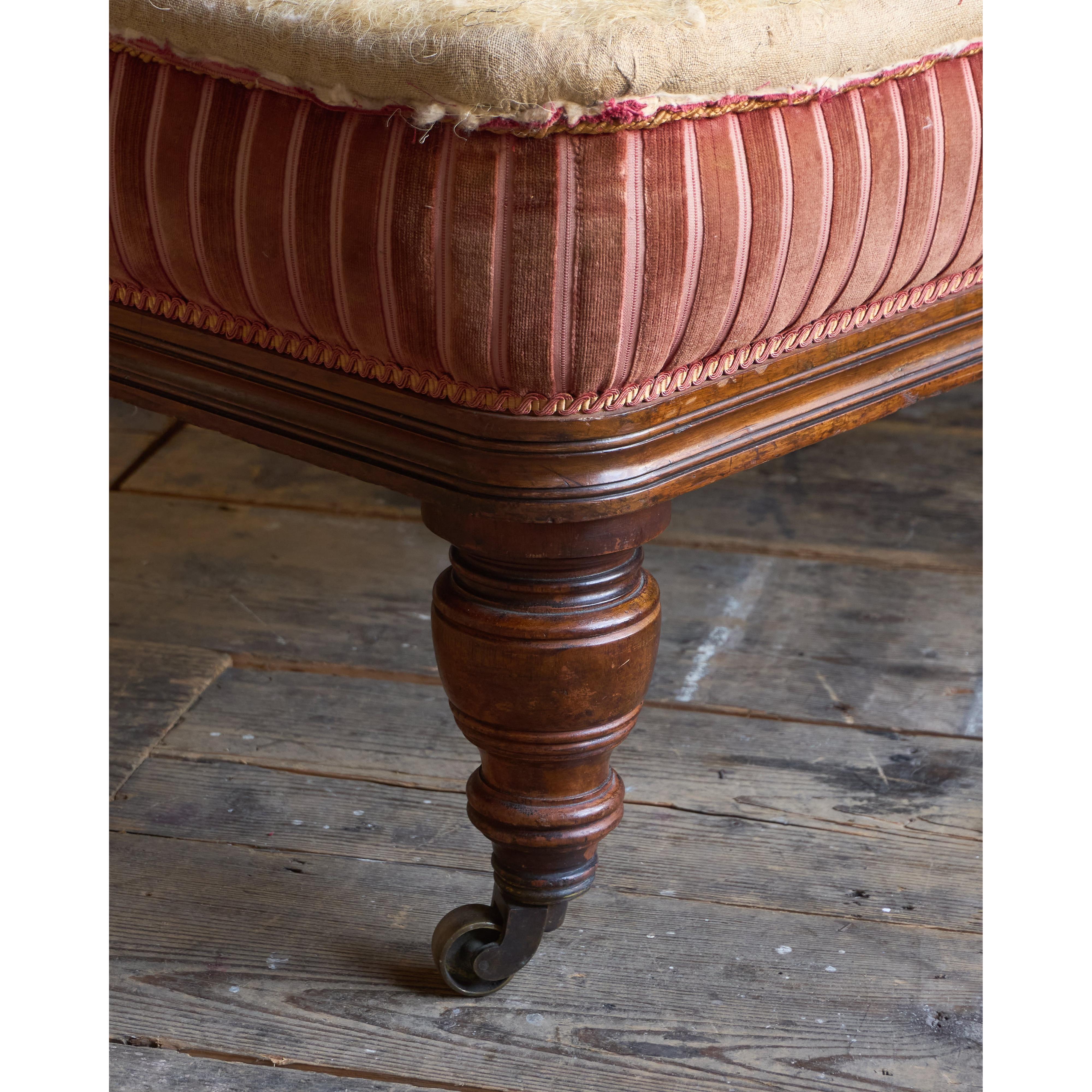 A 19th-century campaign banquette seat, traditionally upholstered throughout with a fully sprung seat and horsehair fillings.