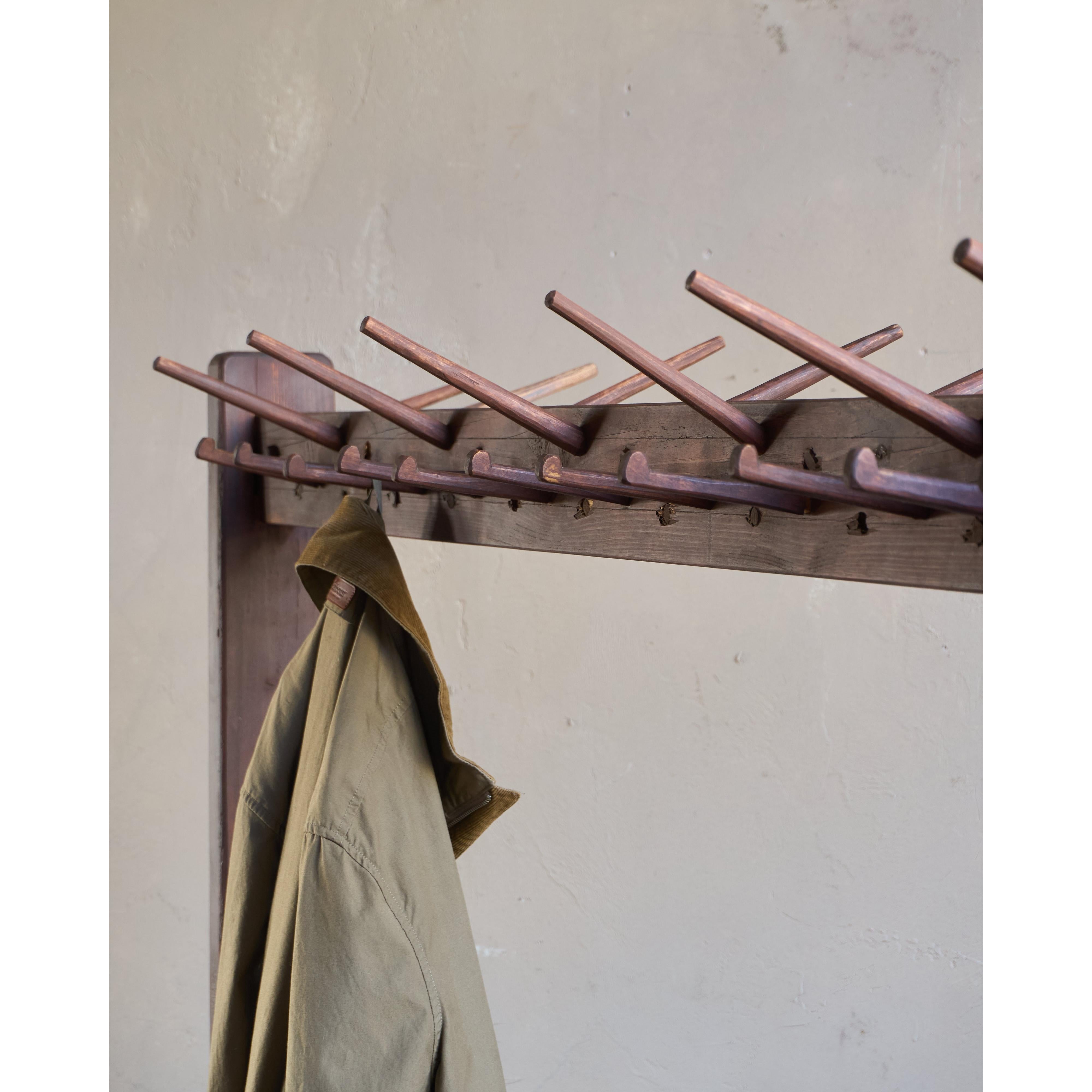 The upper rail has 13 hat hooks and 23 coat hooks.