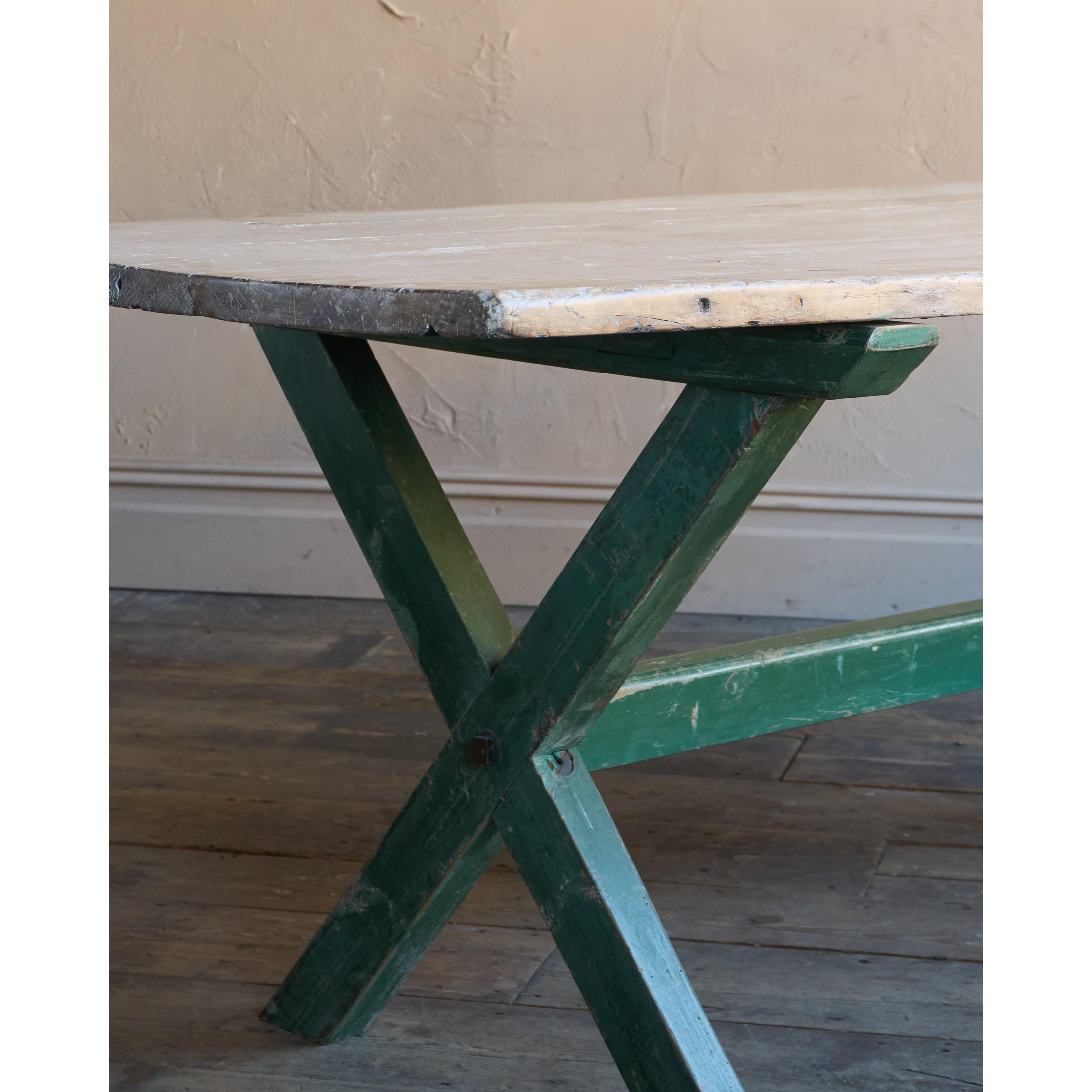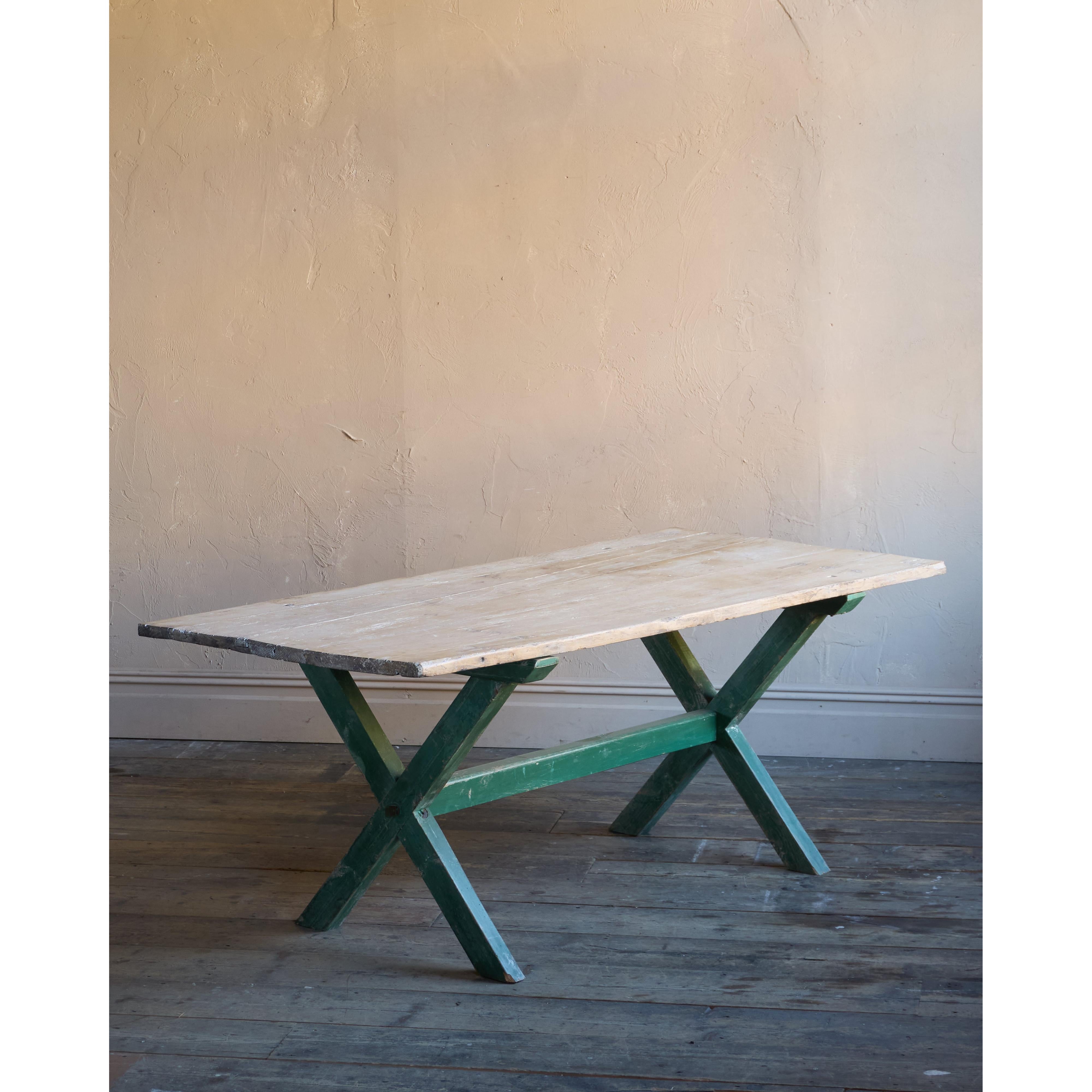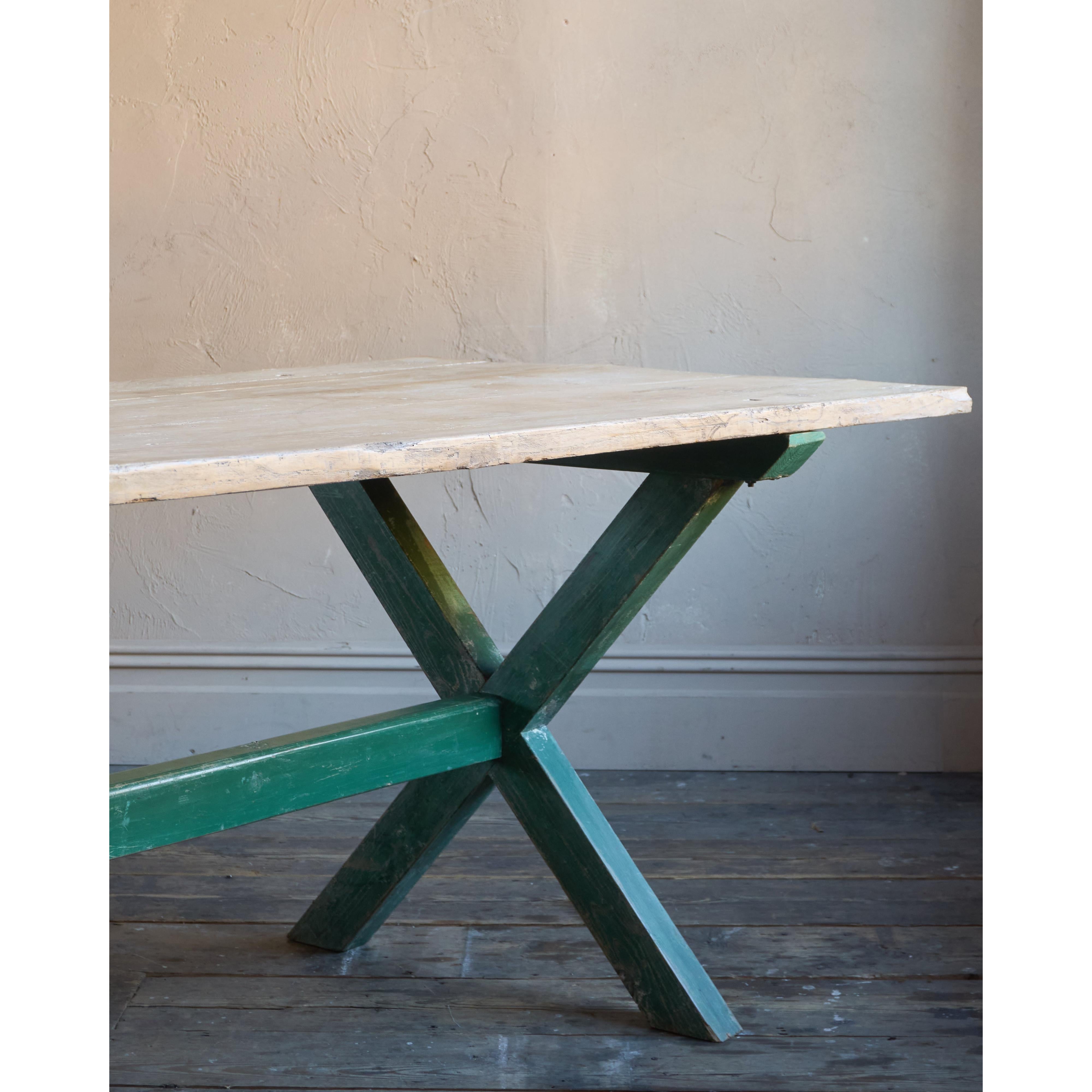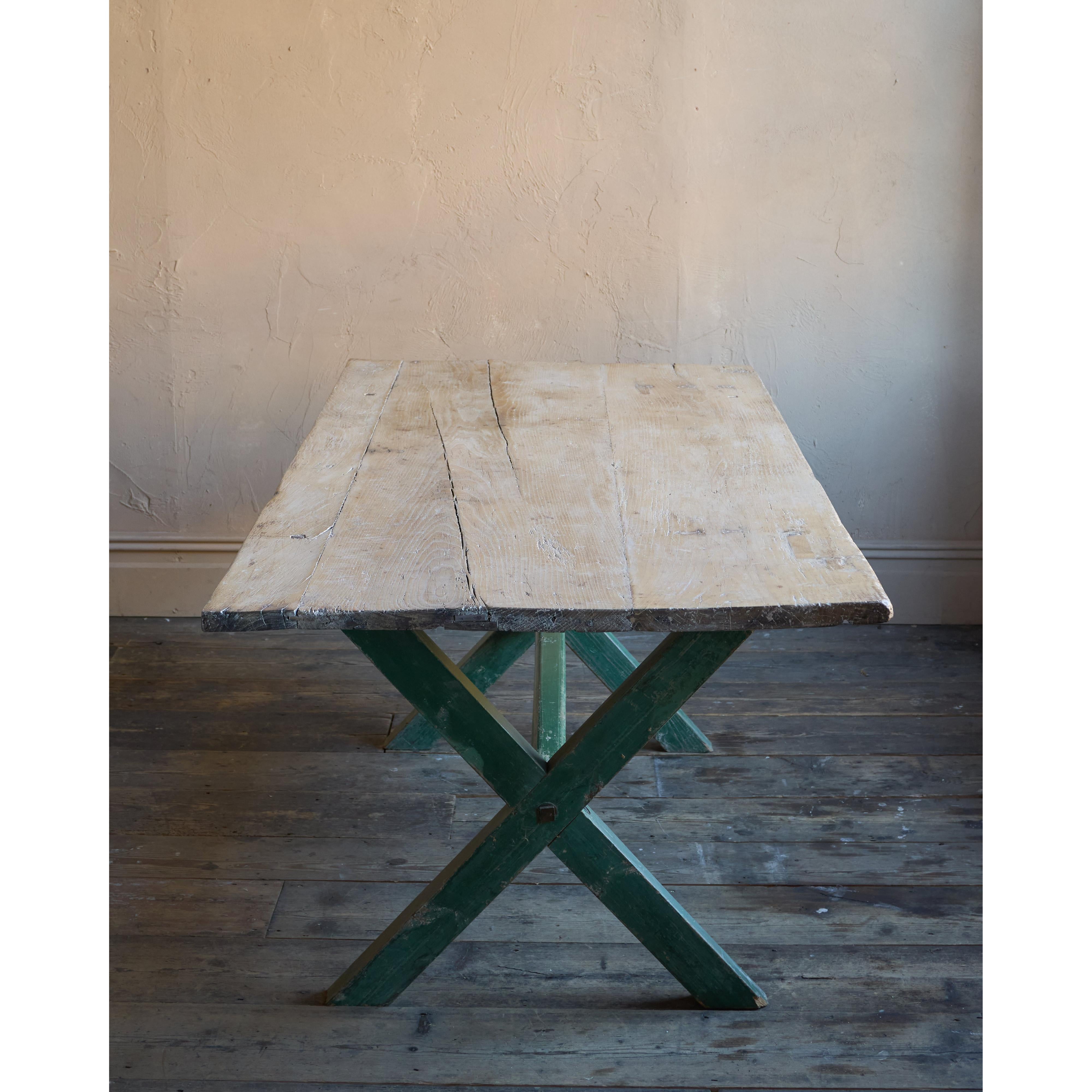 Solid elm top, nicely weathered, with a pine x-leg base, with distressed green paintwork.