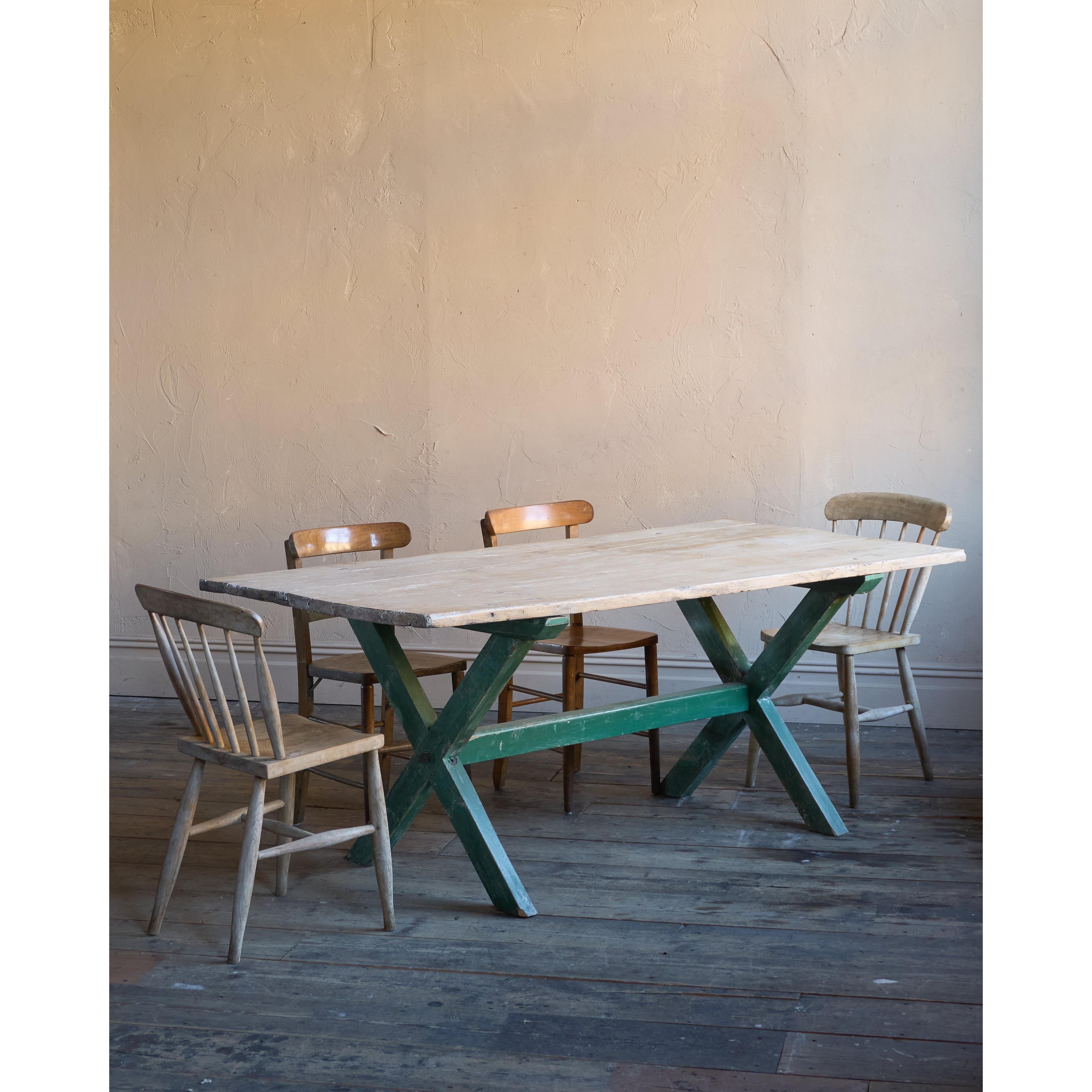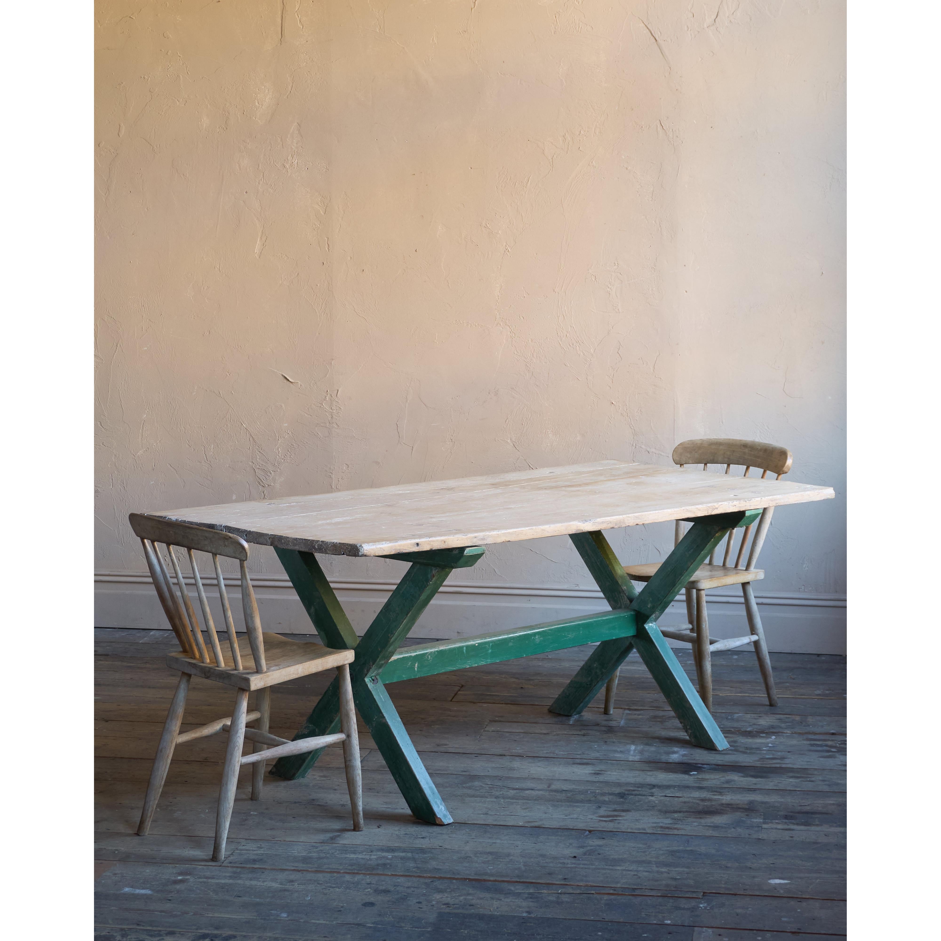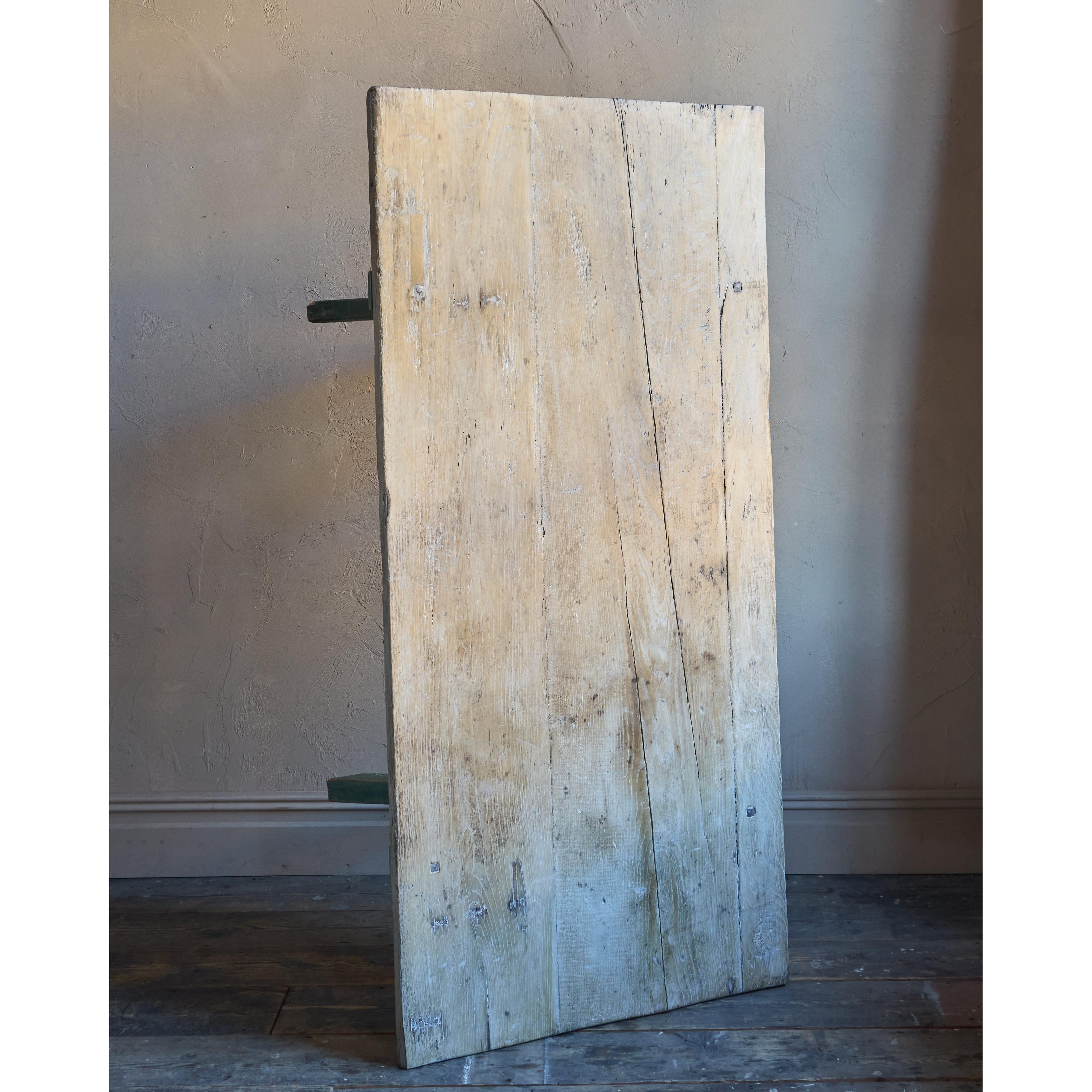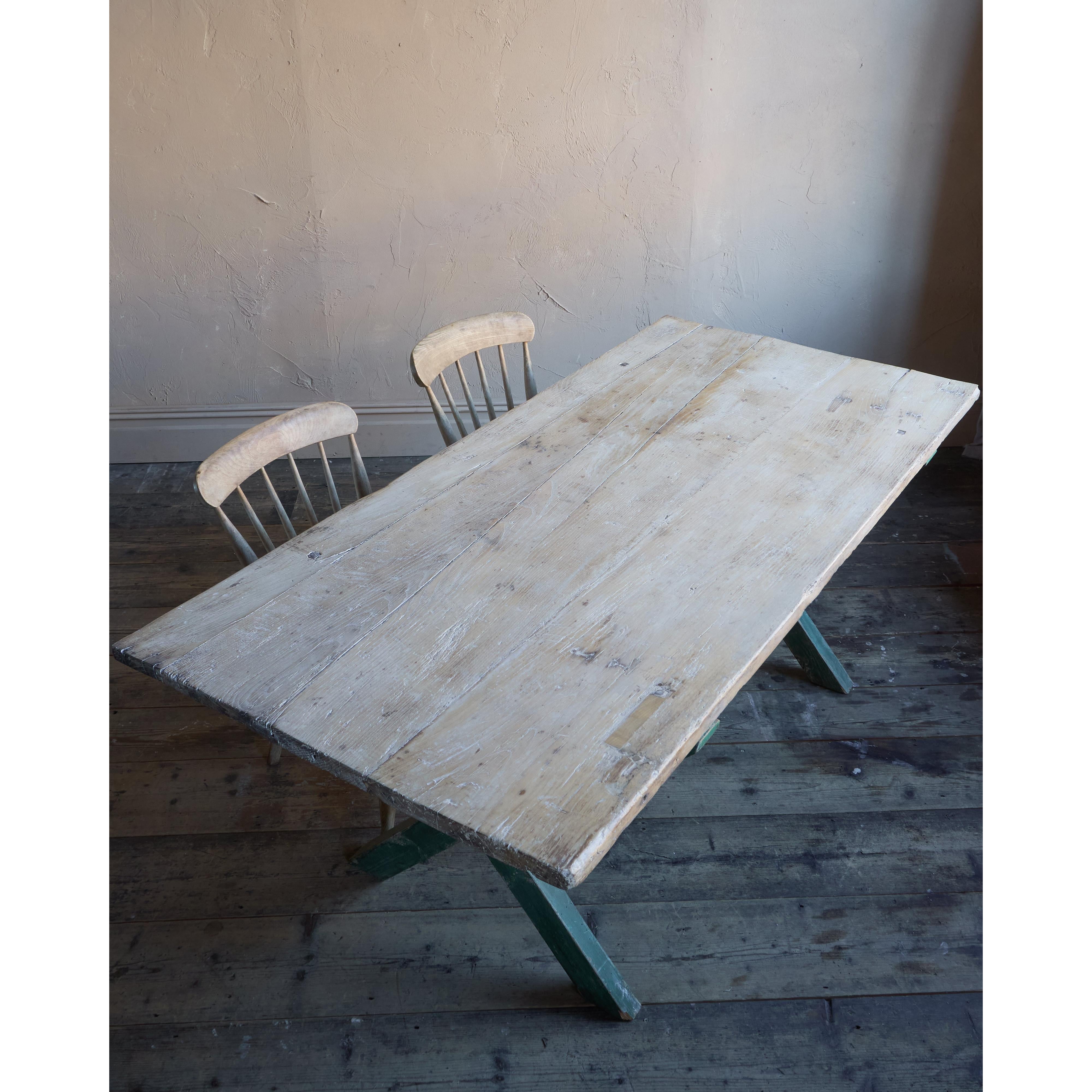 Solid elm top, nicely weathered, with a pine x-leg base, with distressed green paintwork.