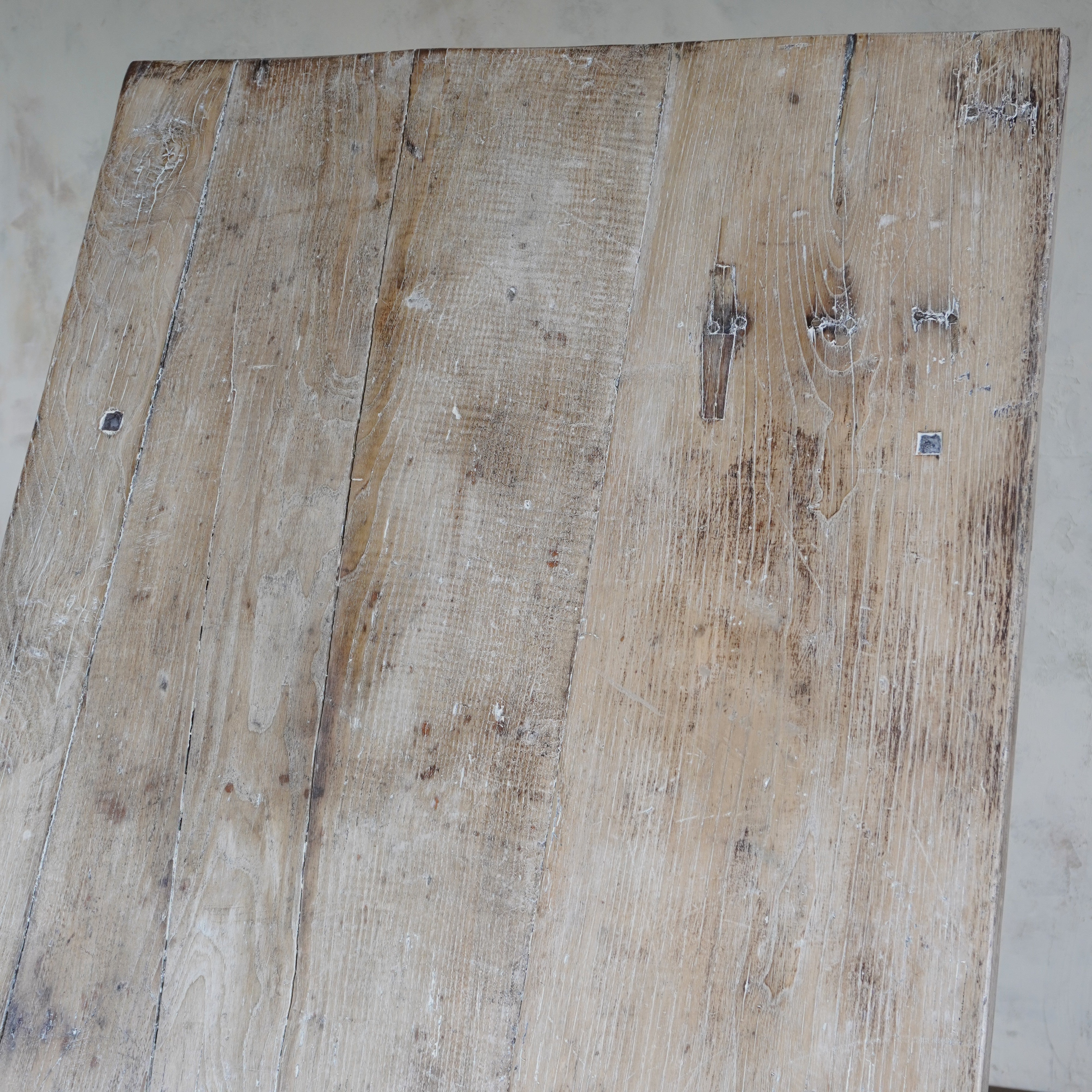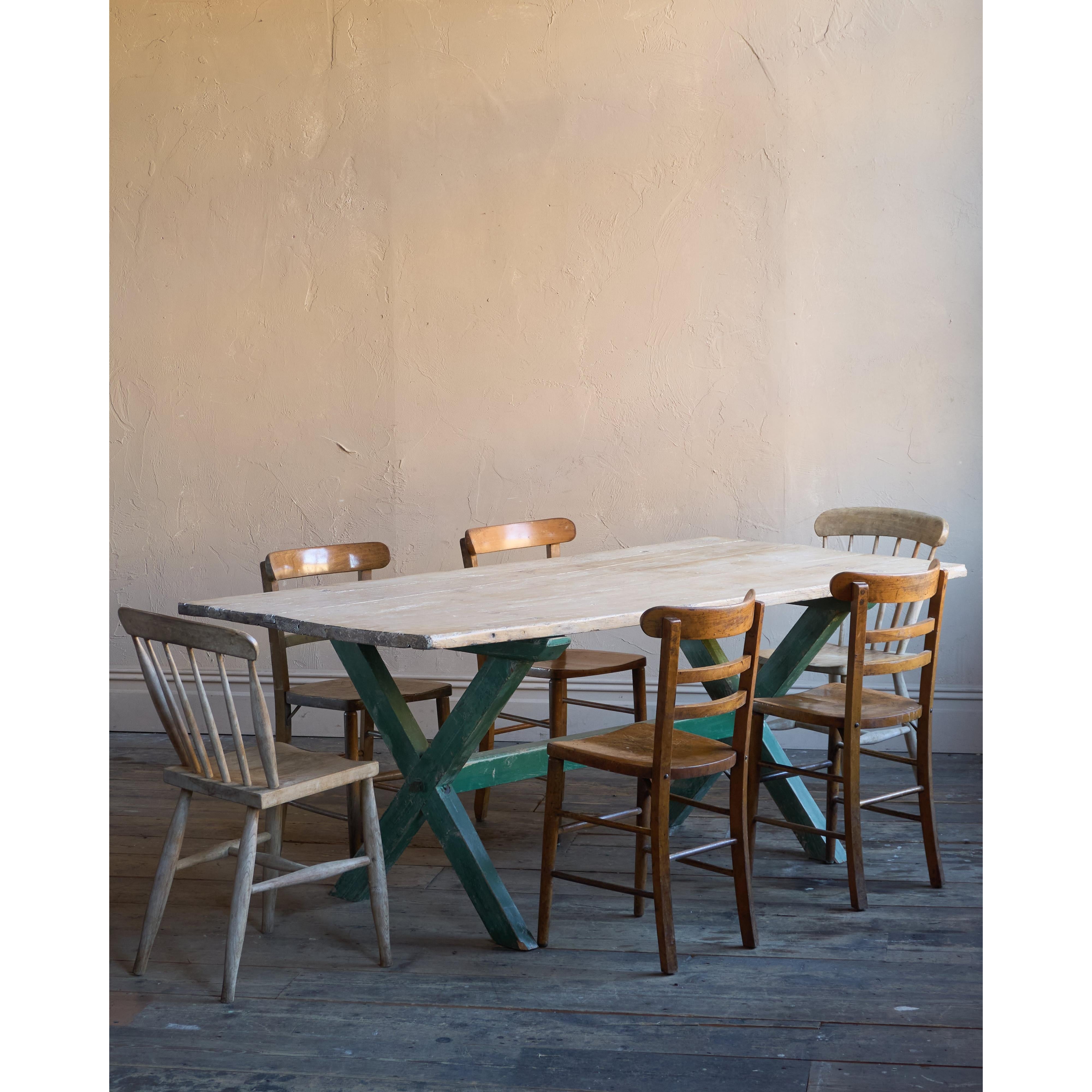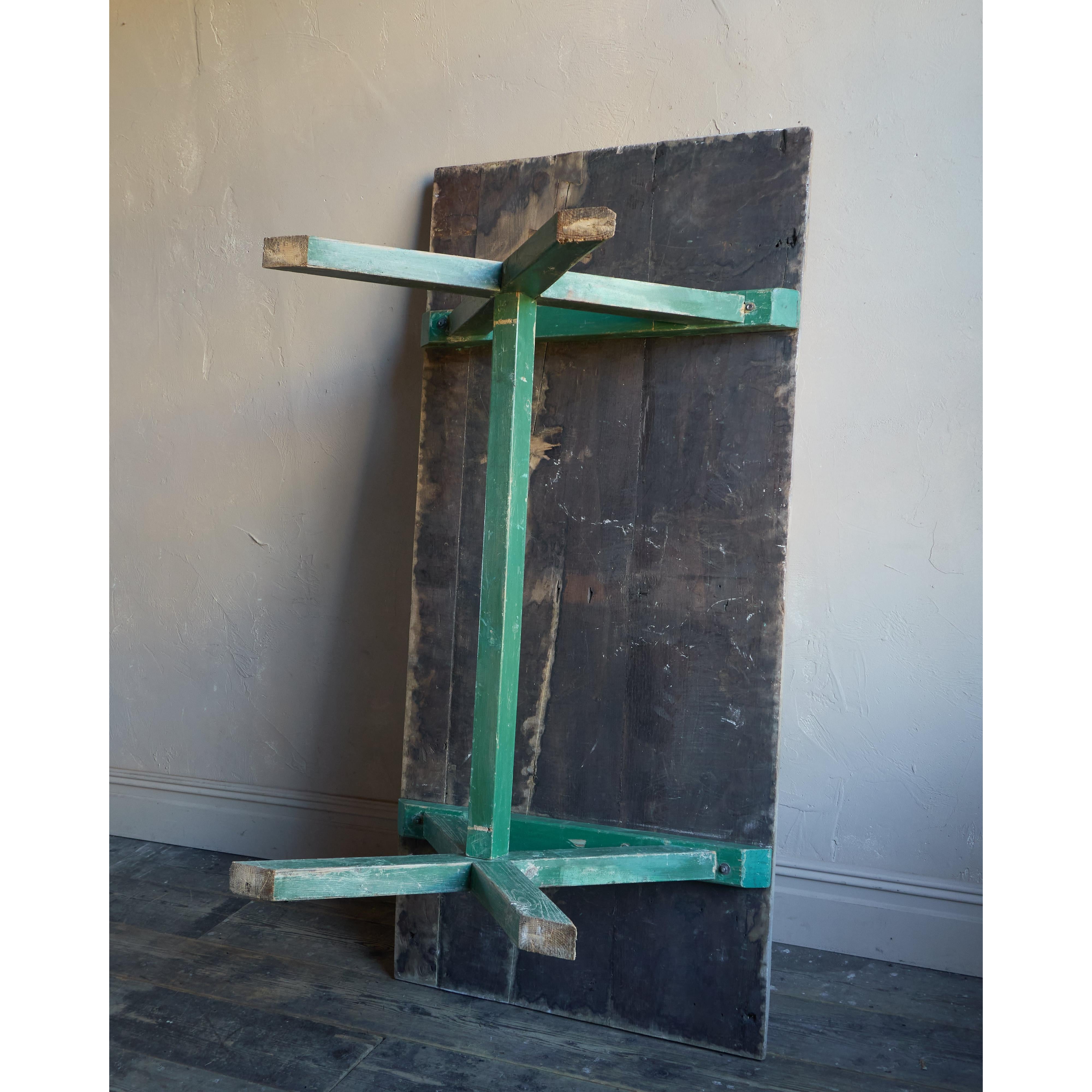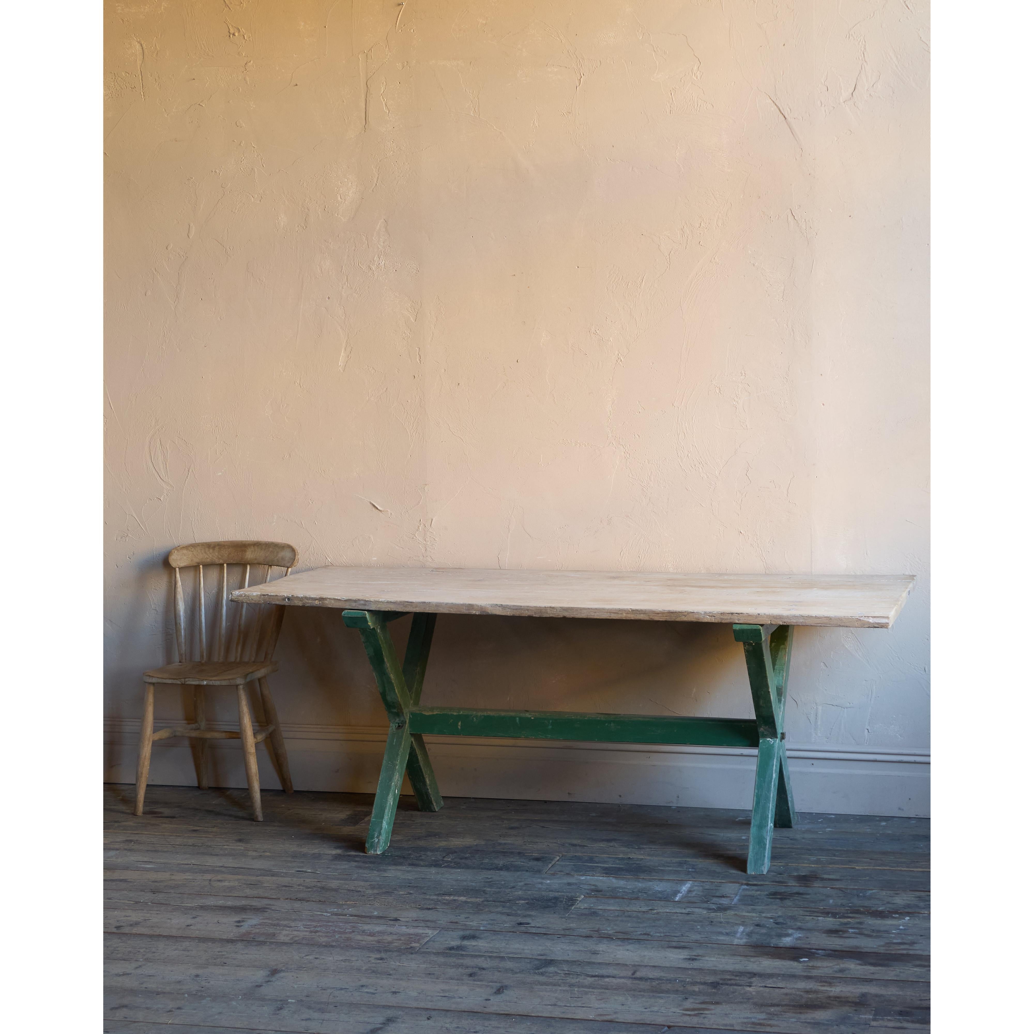 Solid elm top, nicely weathered, with a pine x-leg base, with distressed green paintwork.