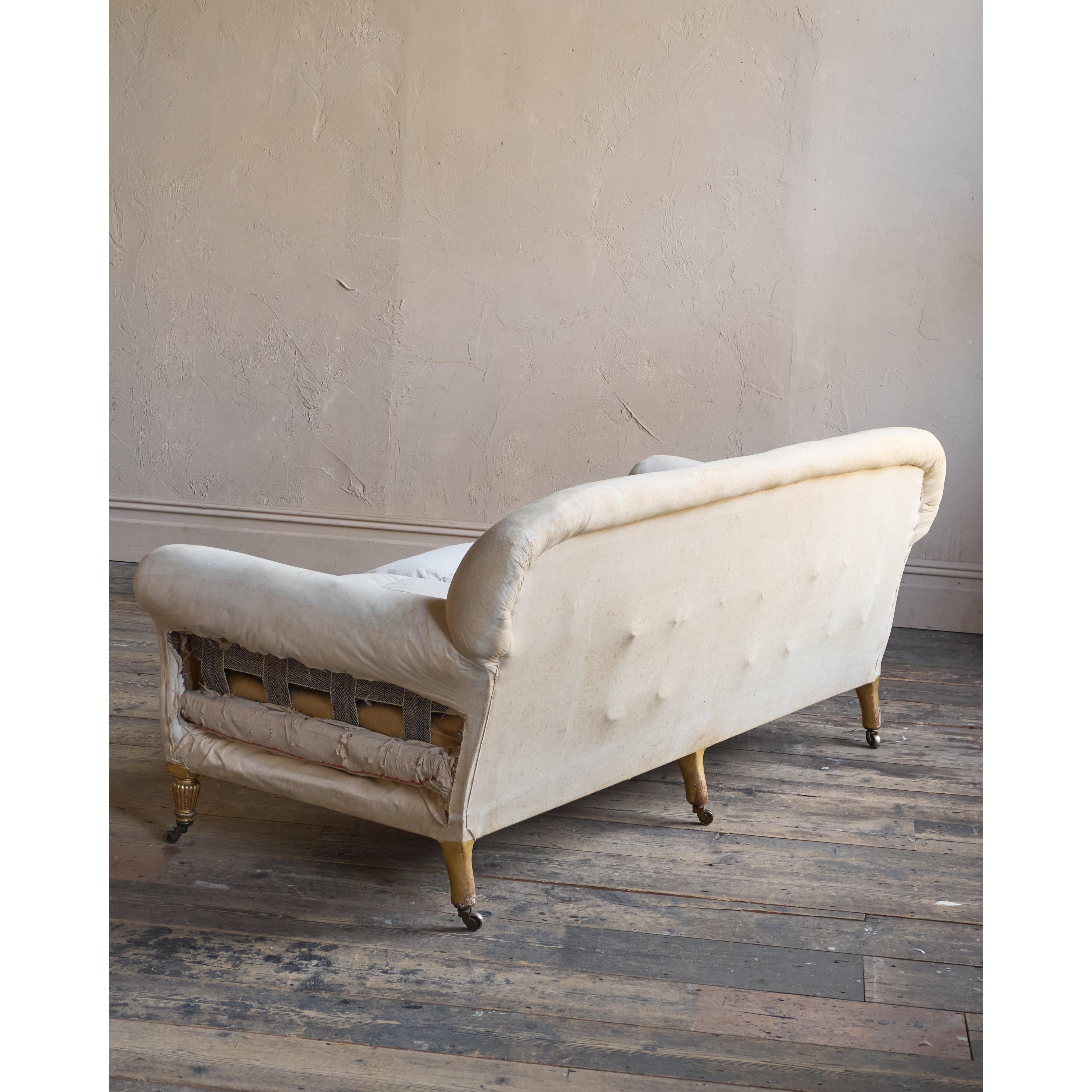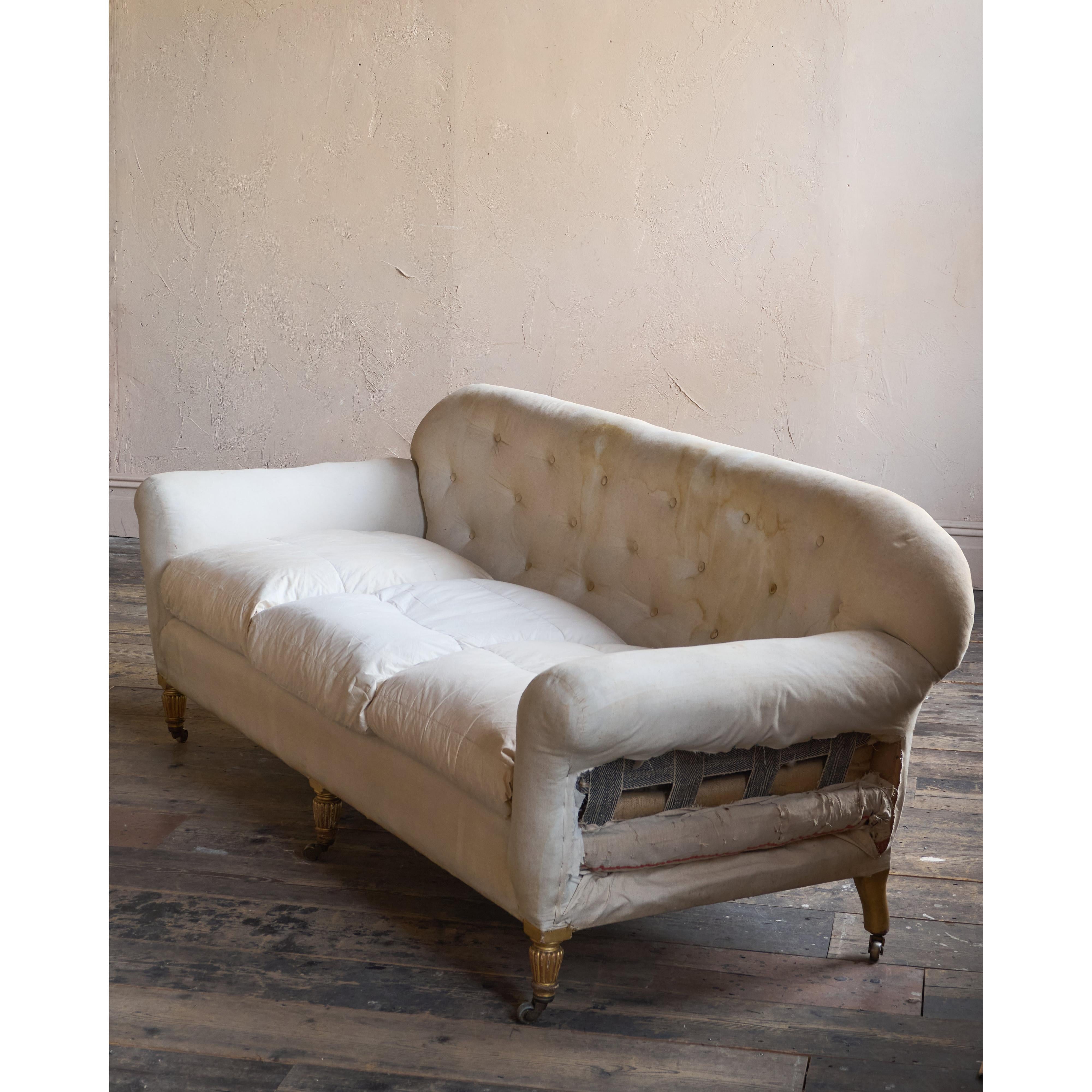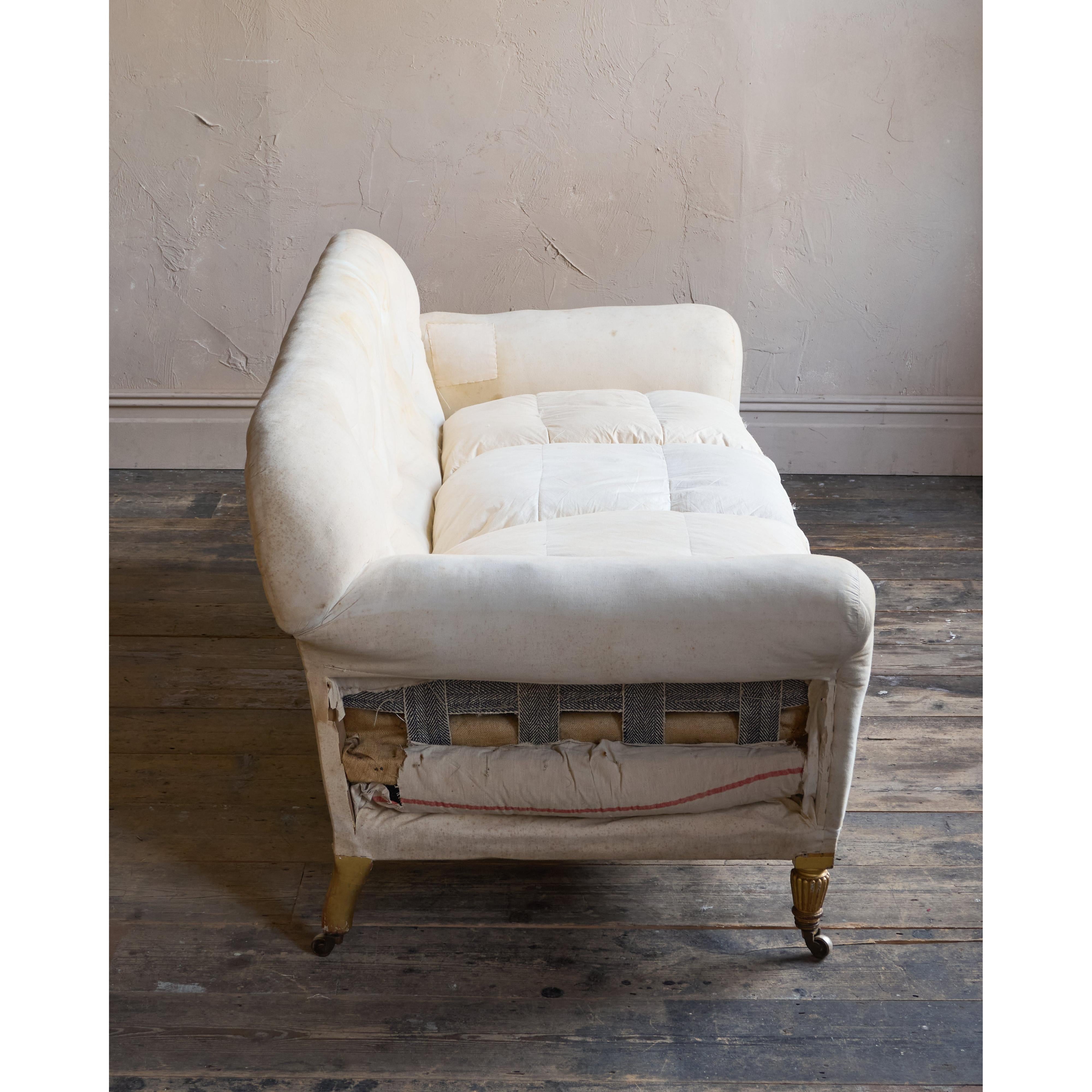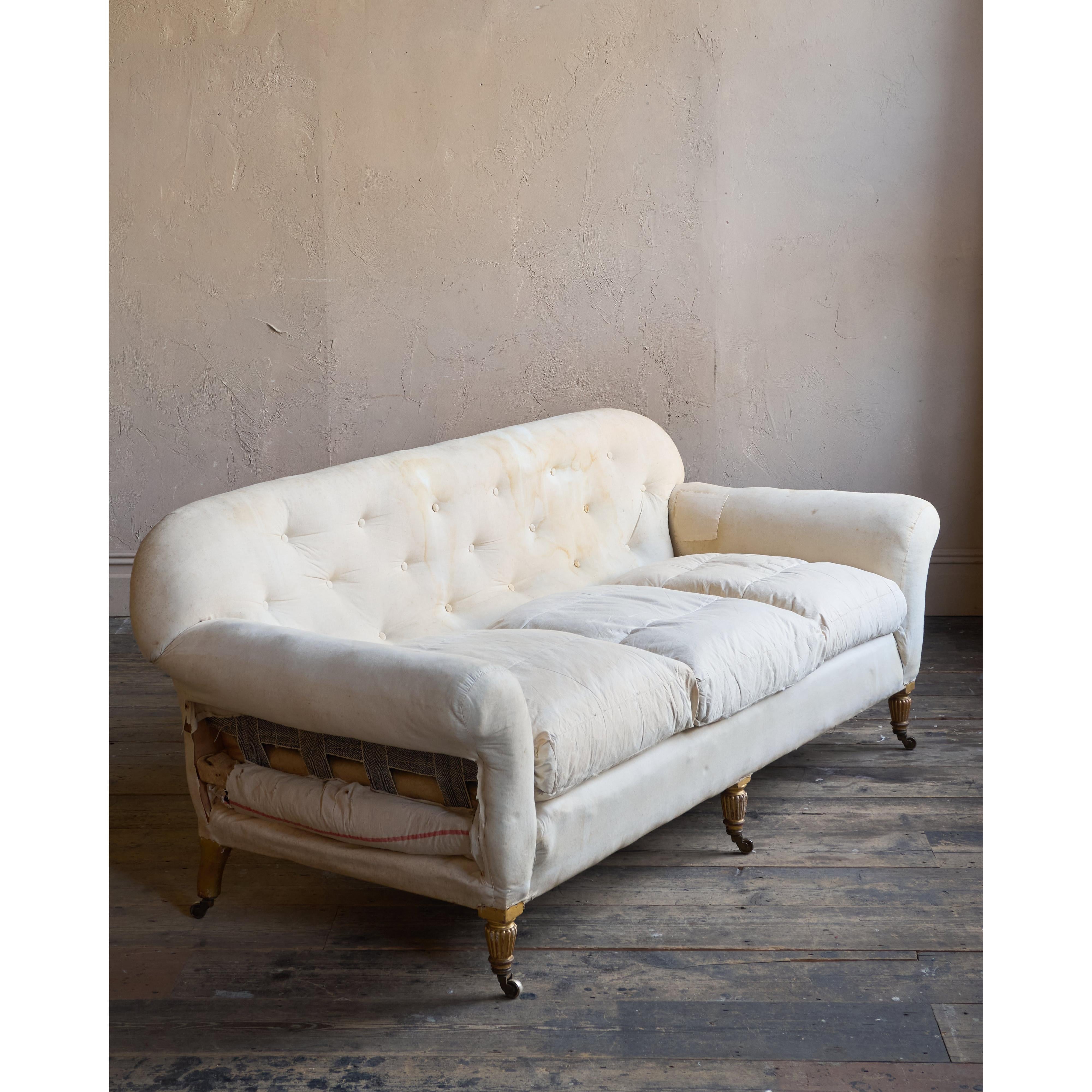 Traditionally upholstered throughout with horsehair fillings and springs to the seat and arms, with feather and down cushions to the seat.
