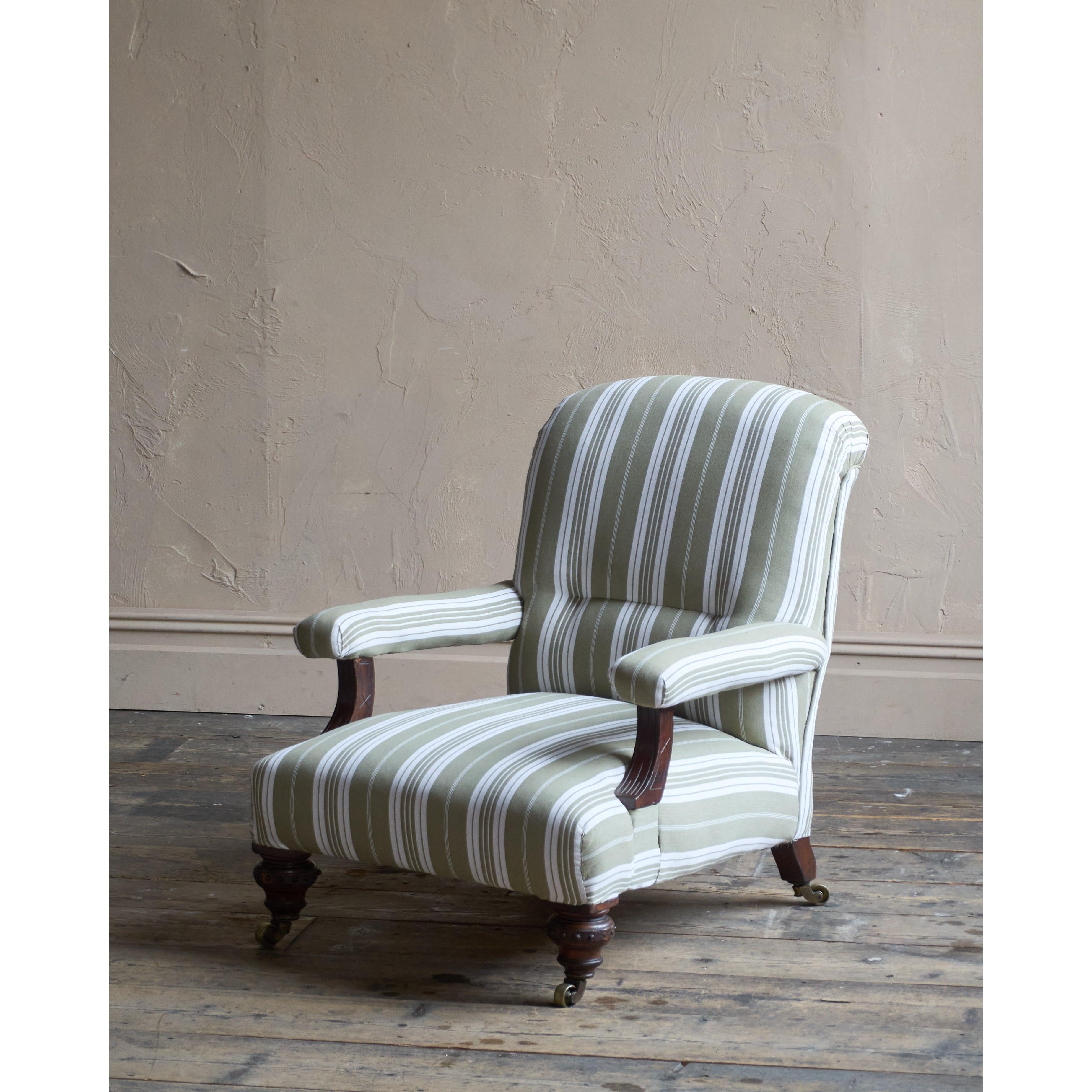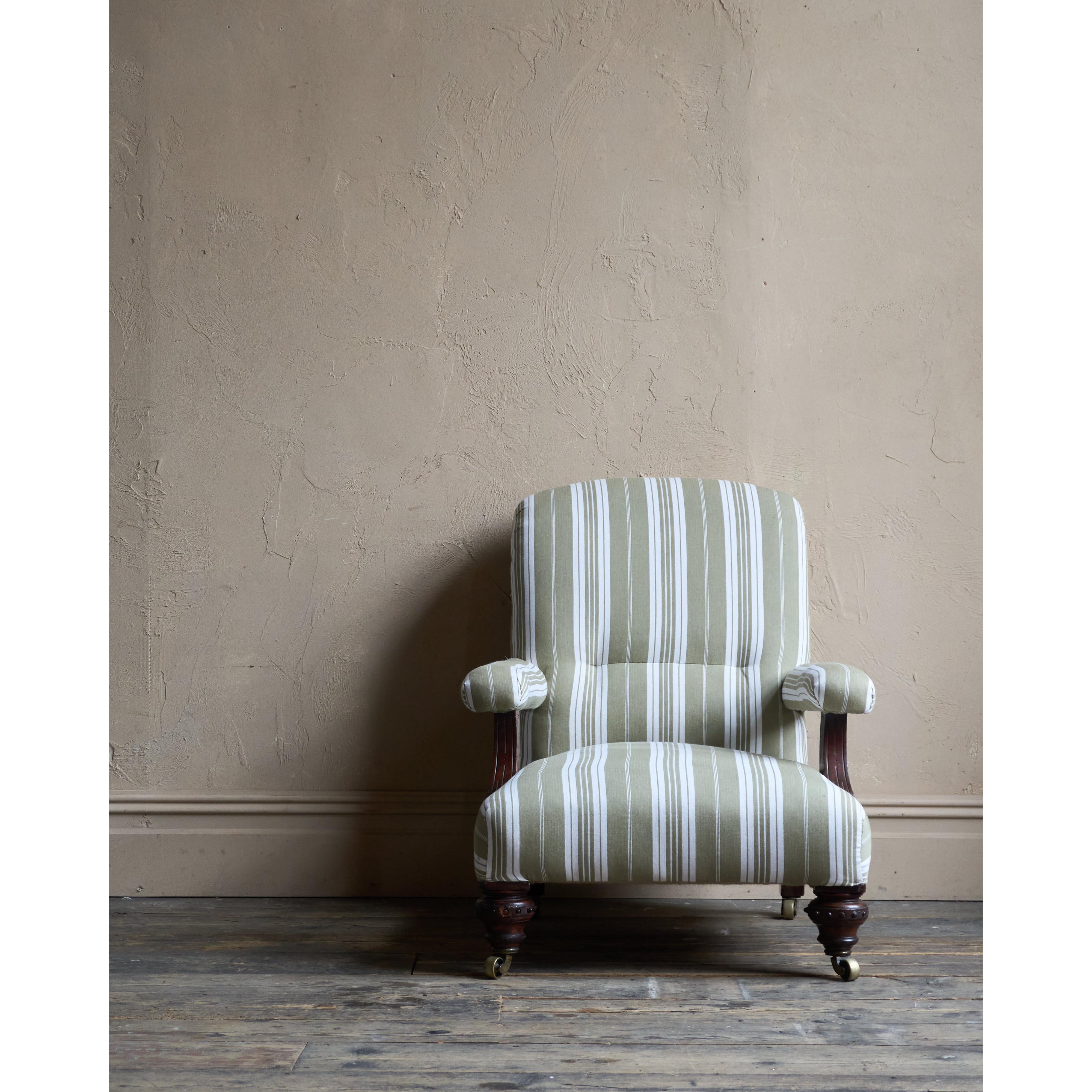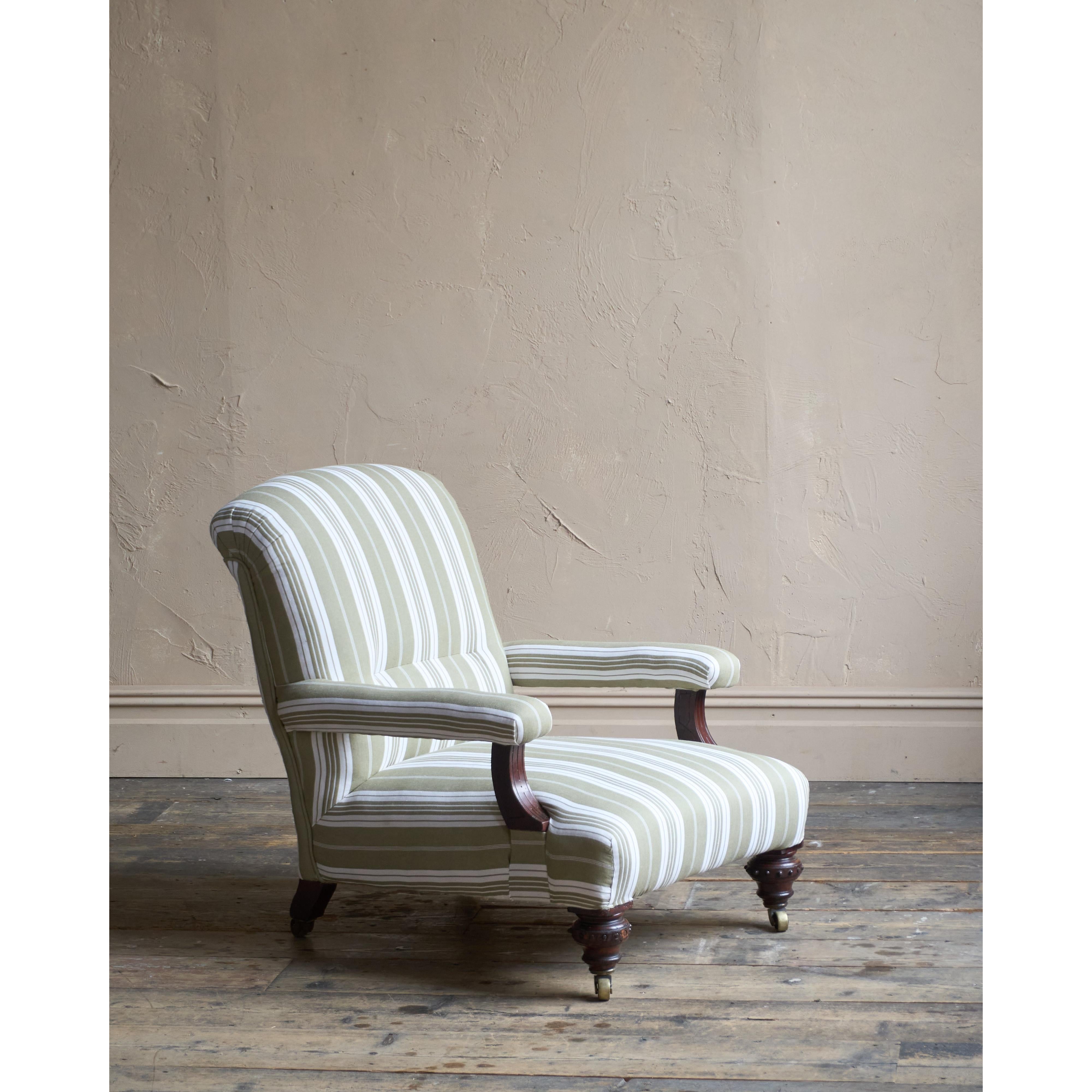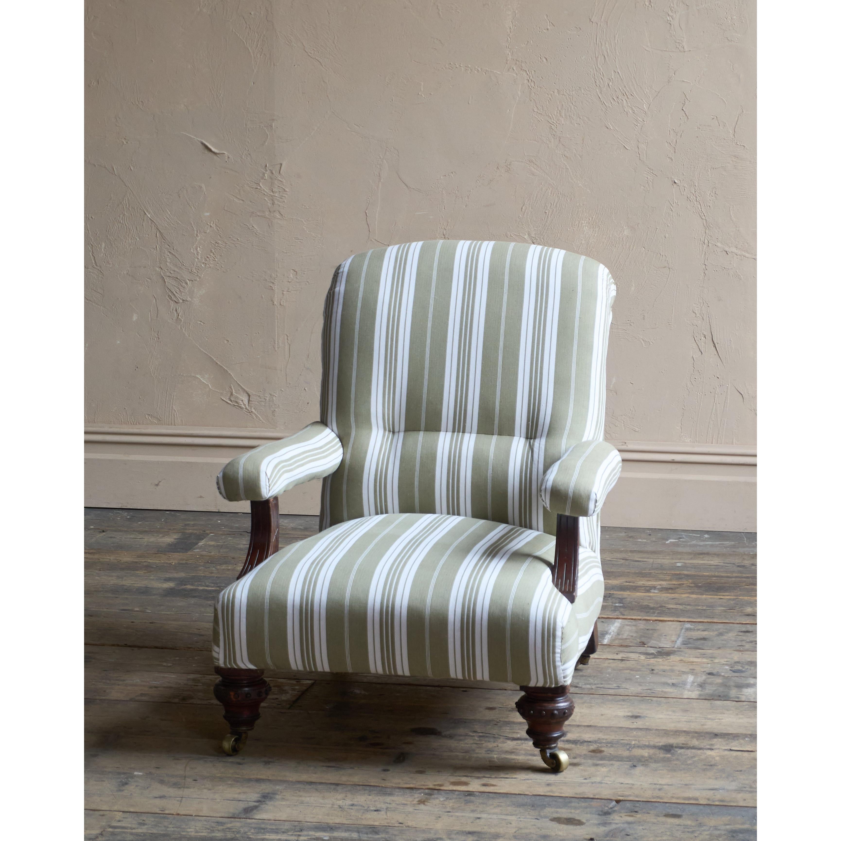 The chair has been lined with a browny-green striped linen ticking, making it ready for an uncomplicated upholstery job.