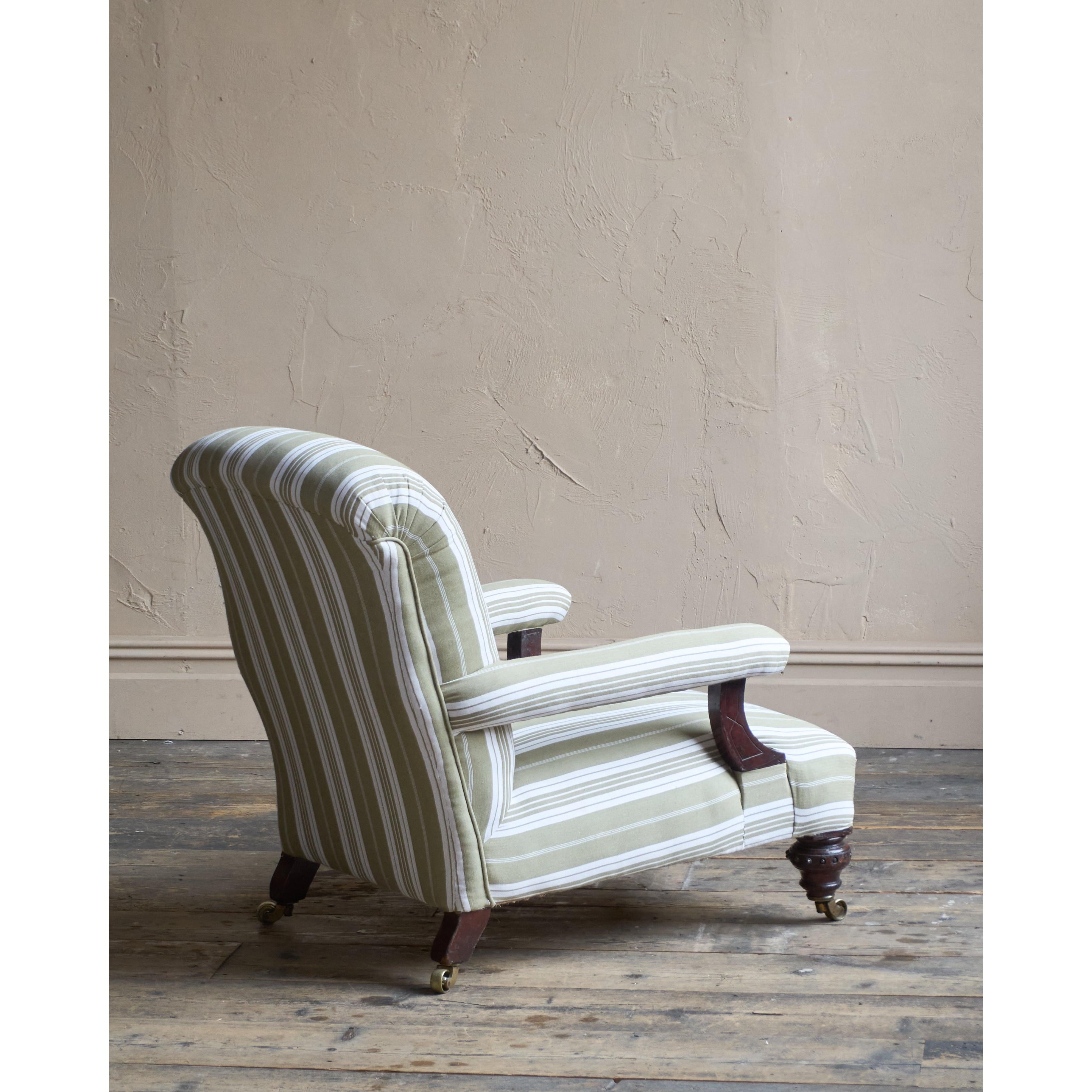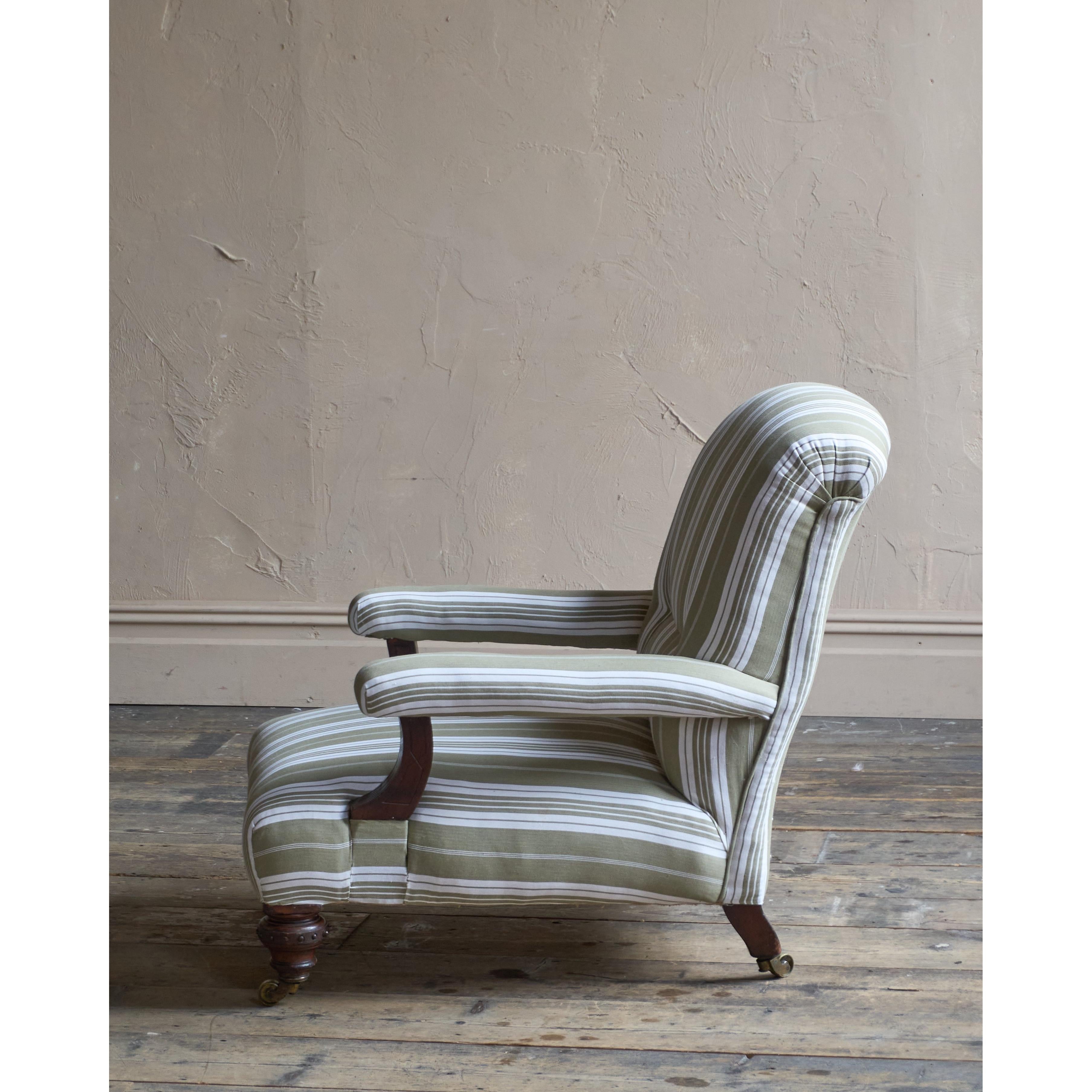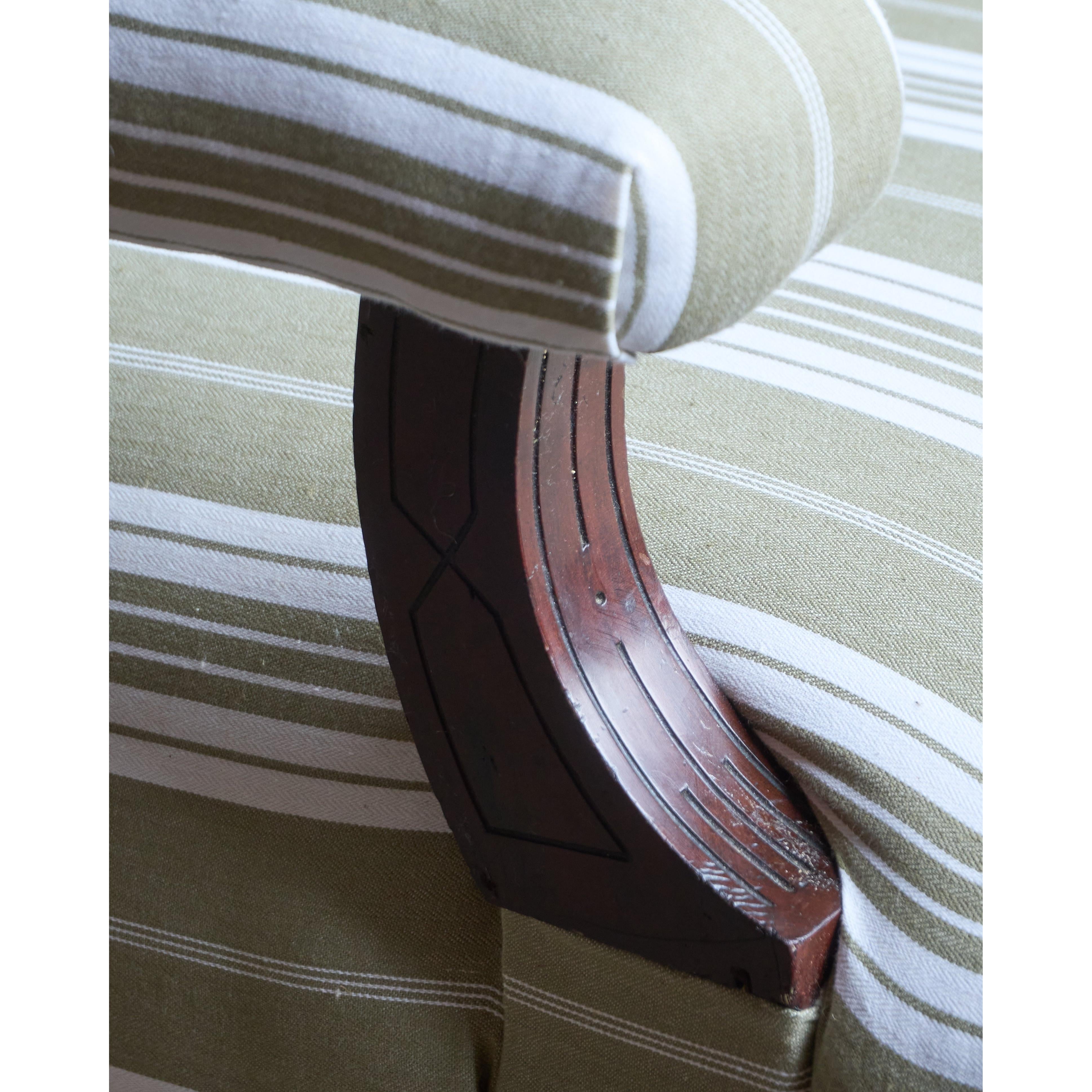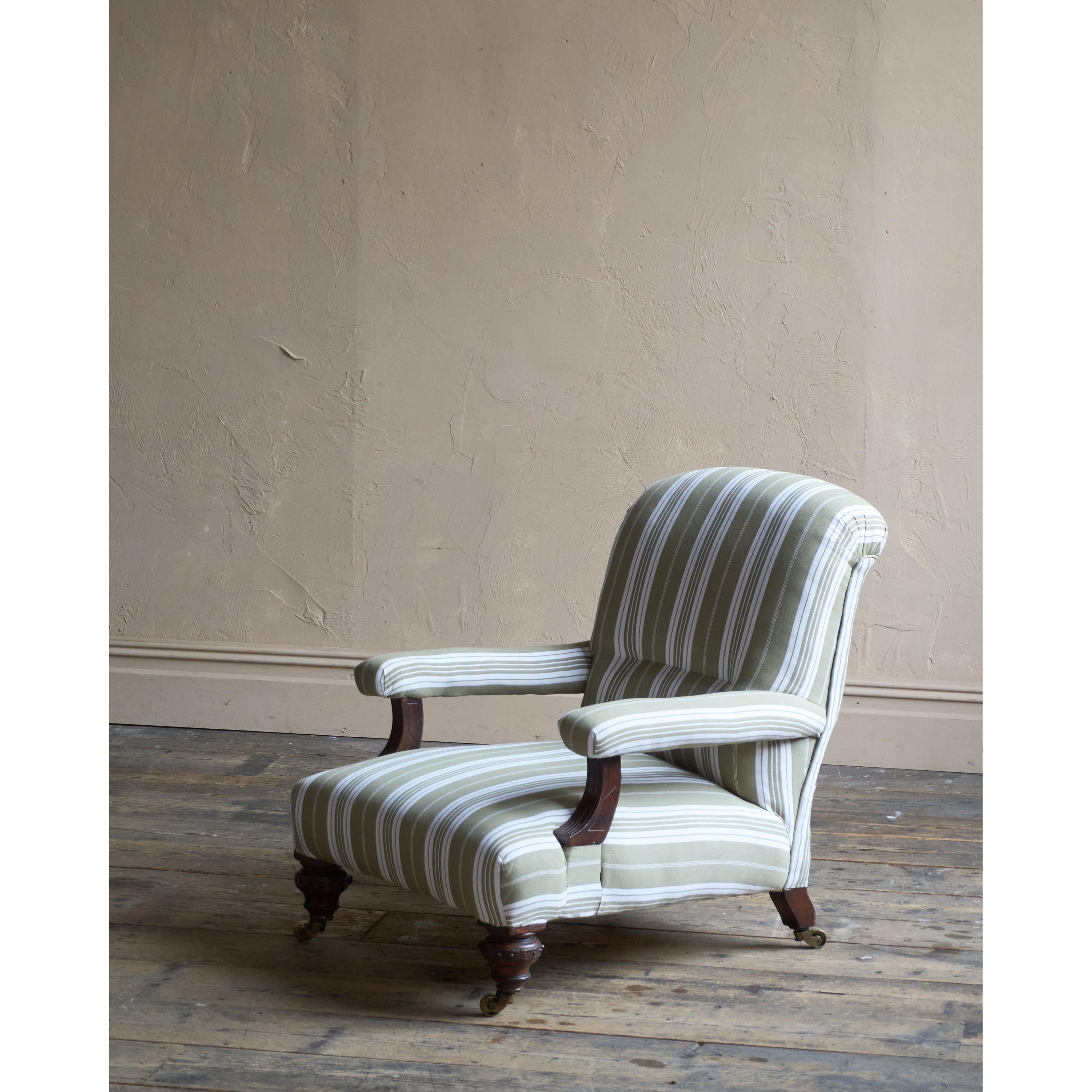 The chair has been lined with a browny-green striped linen ticking, making it ready for an uncomplicated upholstery job.