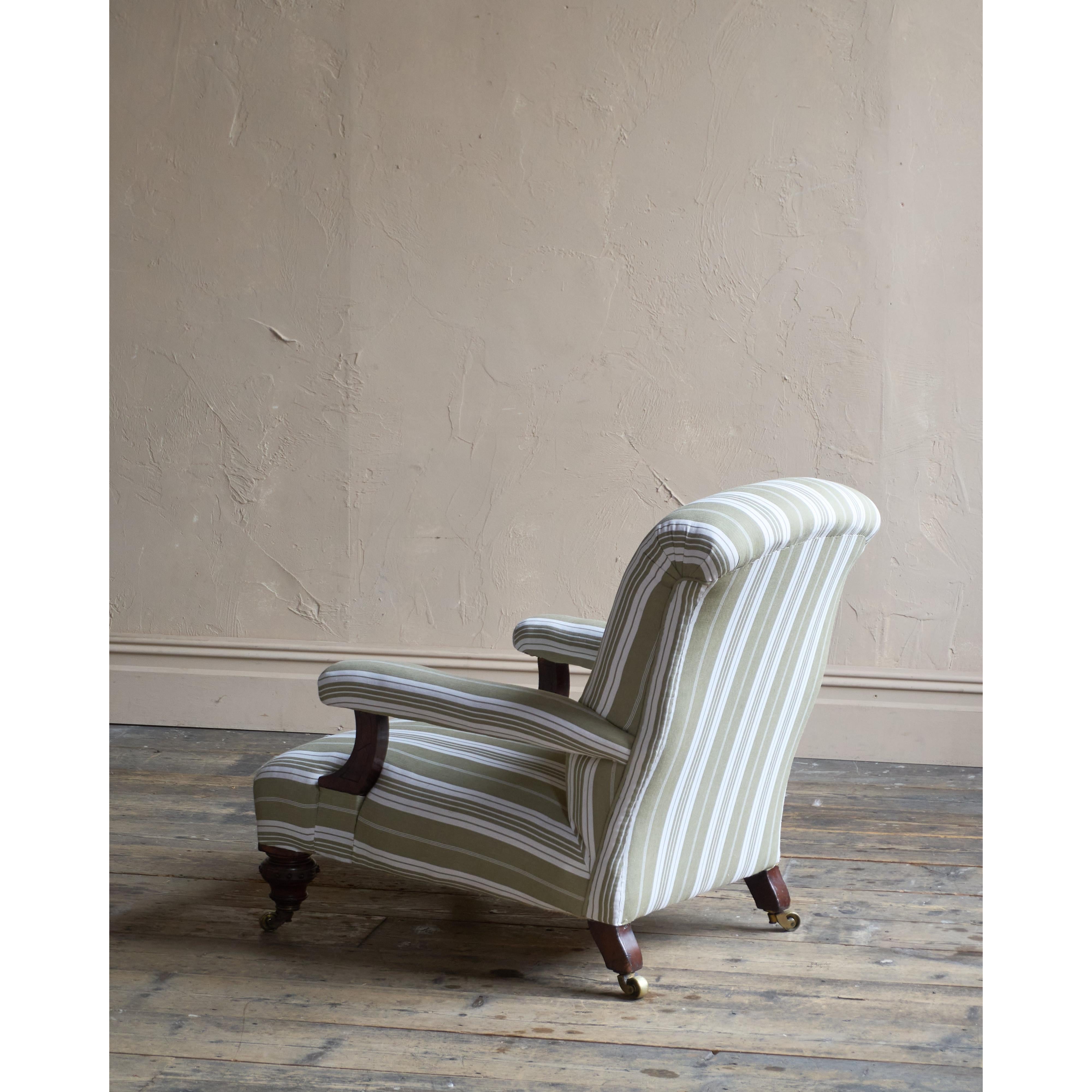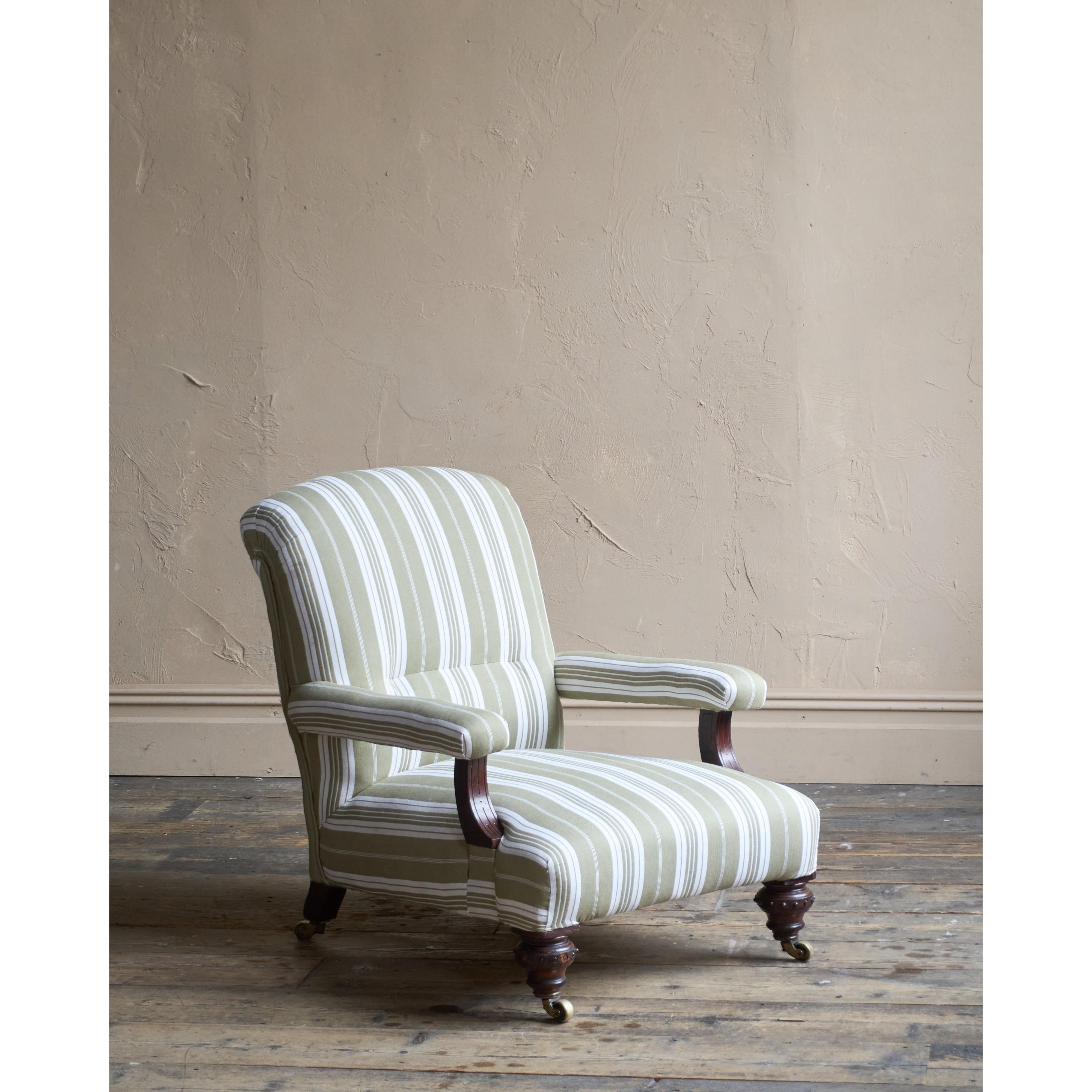A 19th-century deep-seated open armchair with chunky solid mahogany legs and robust brass castors, complemented by solid mahogany arm supports with linear detailing.