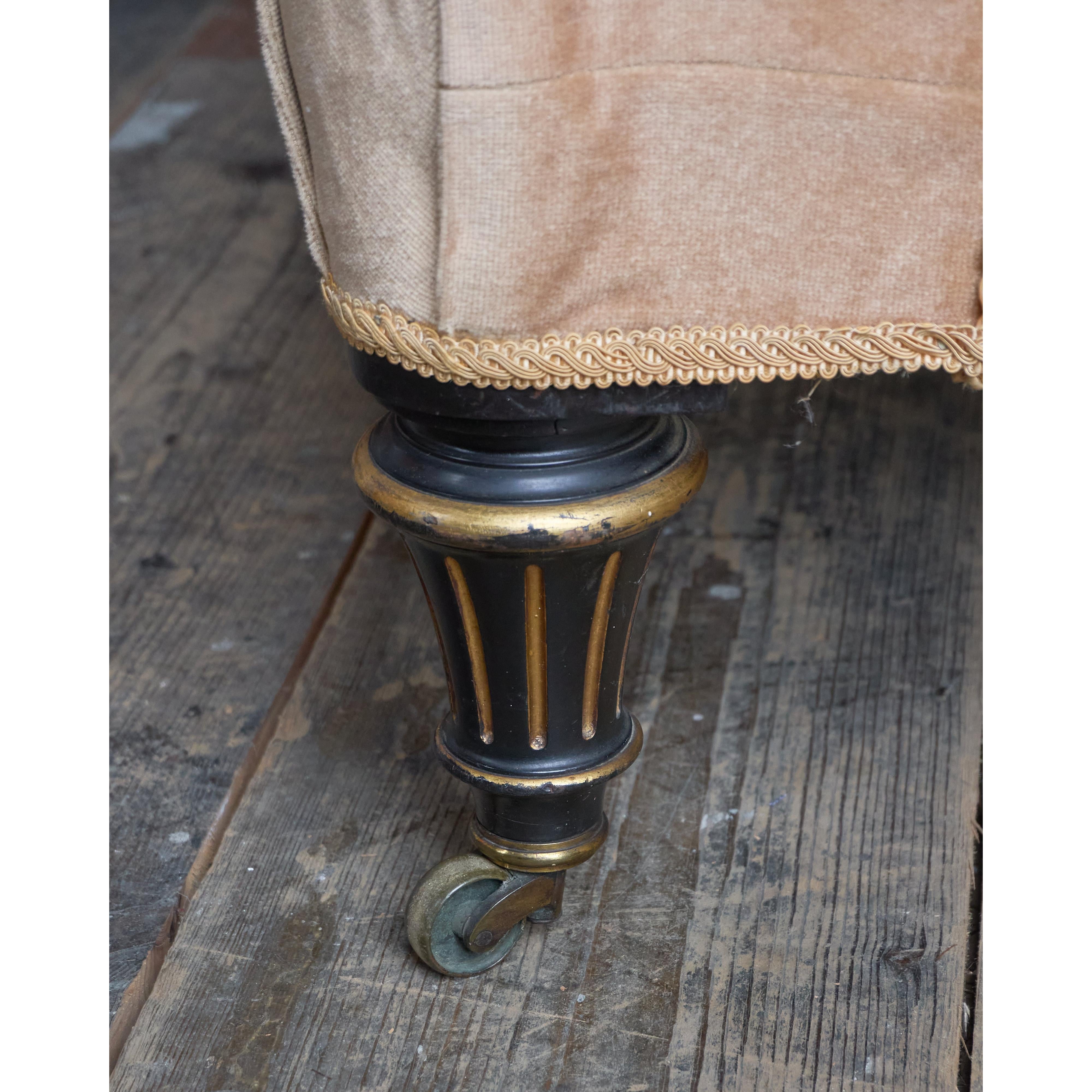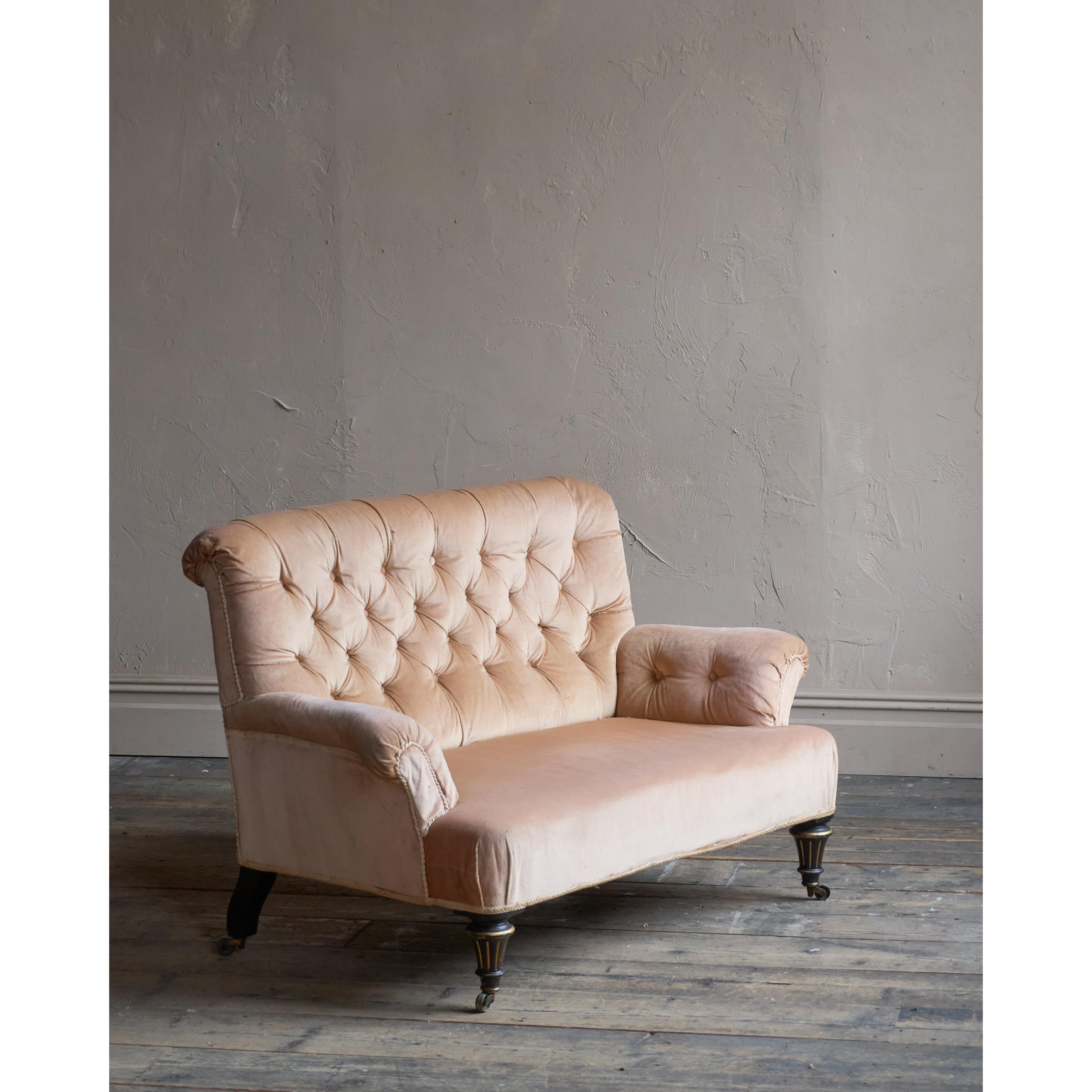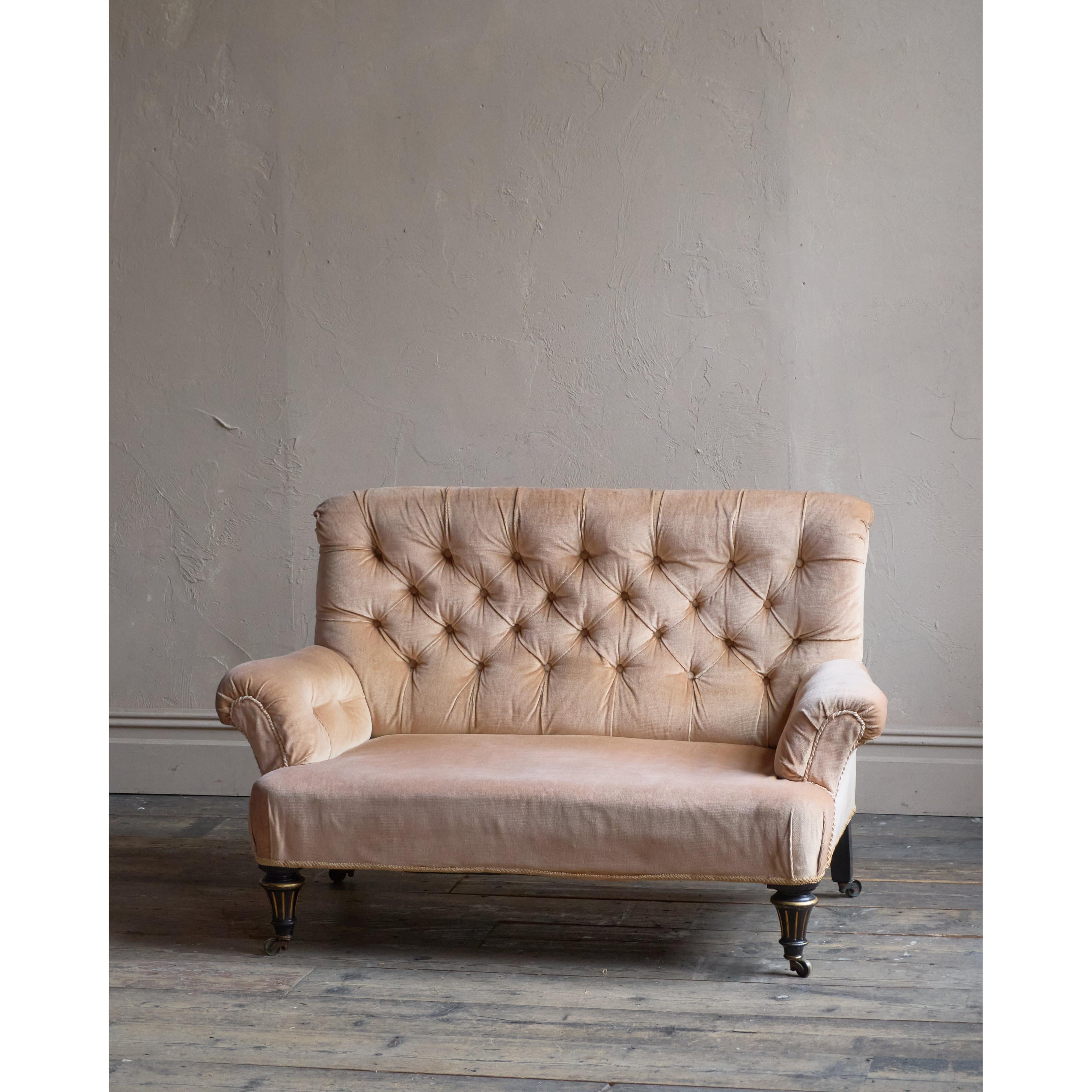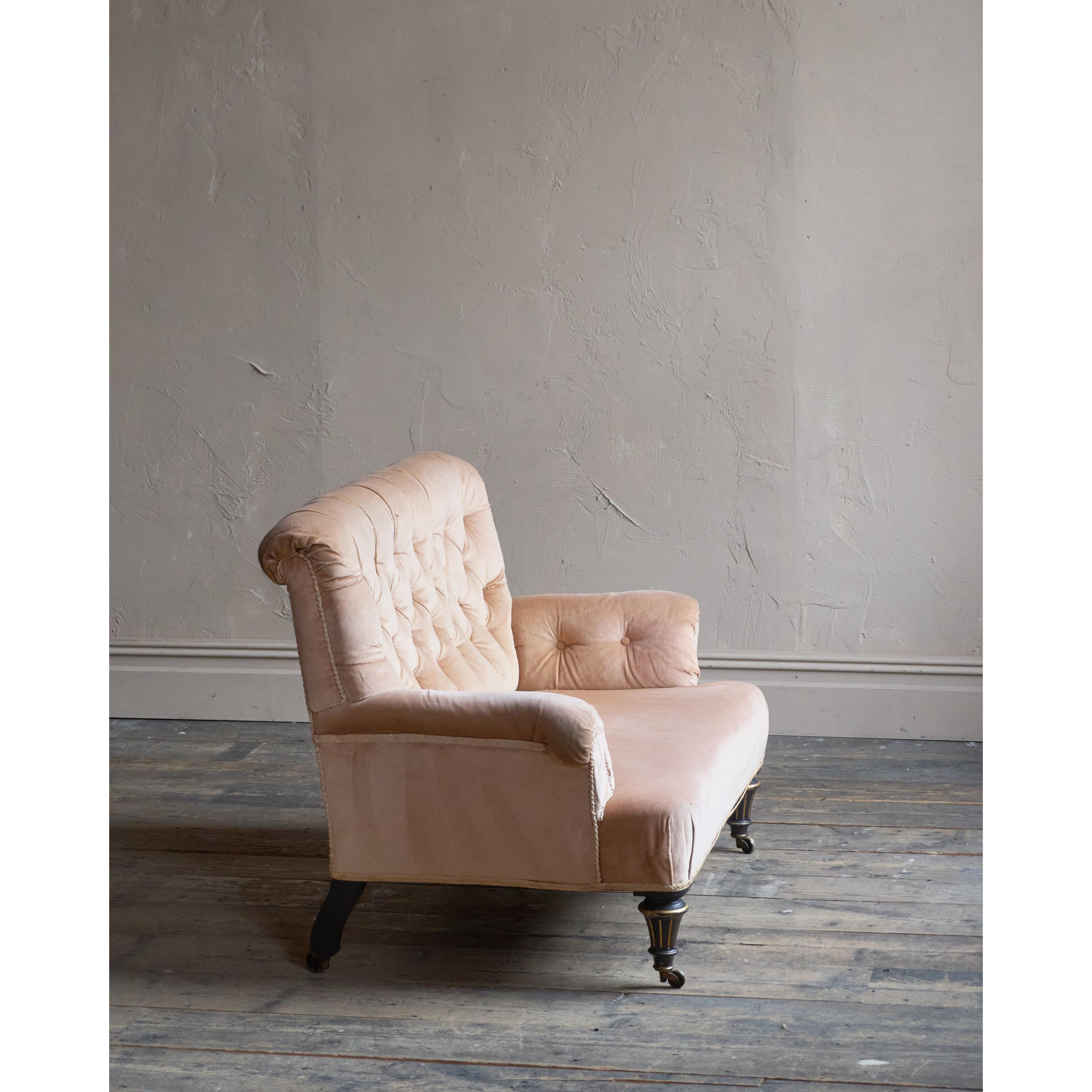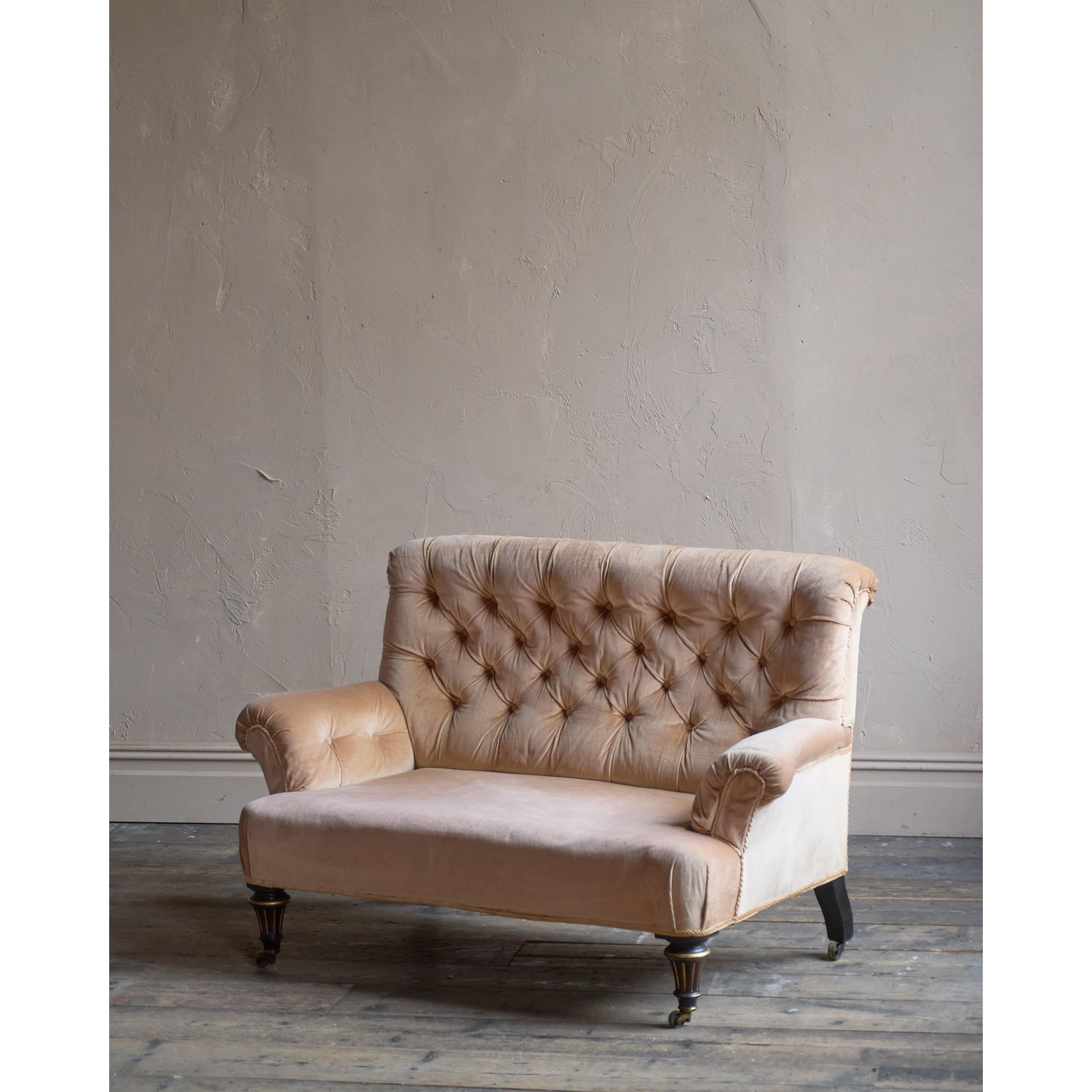 Deep-buttoned back, covered in a peach-coloured velvet which is in good condition. Traditionally upholstered underneath.