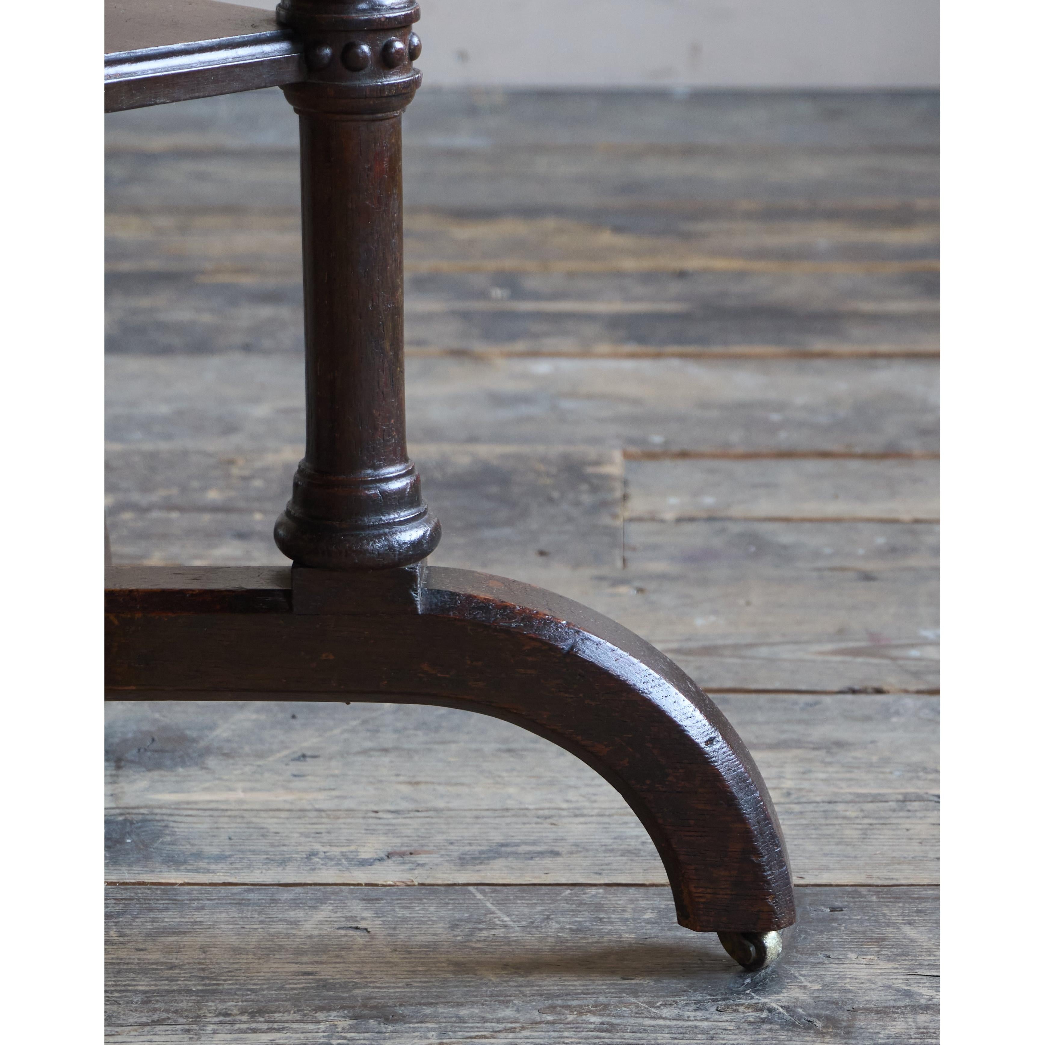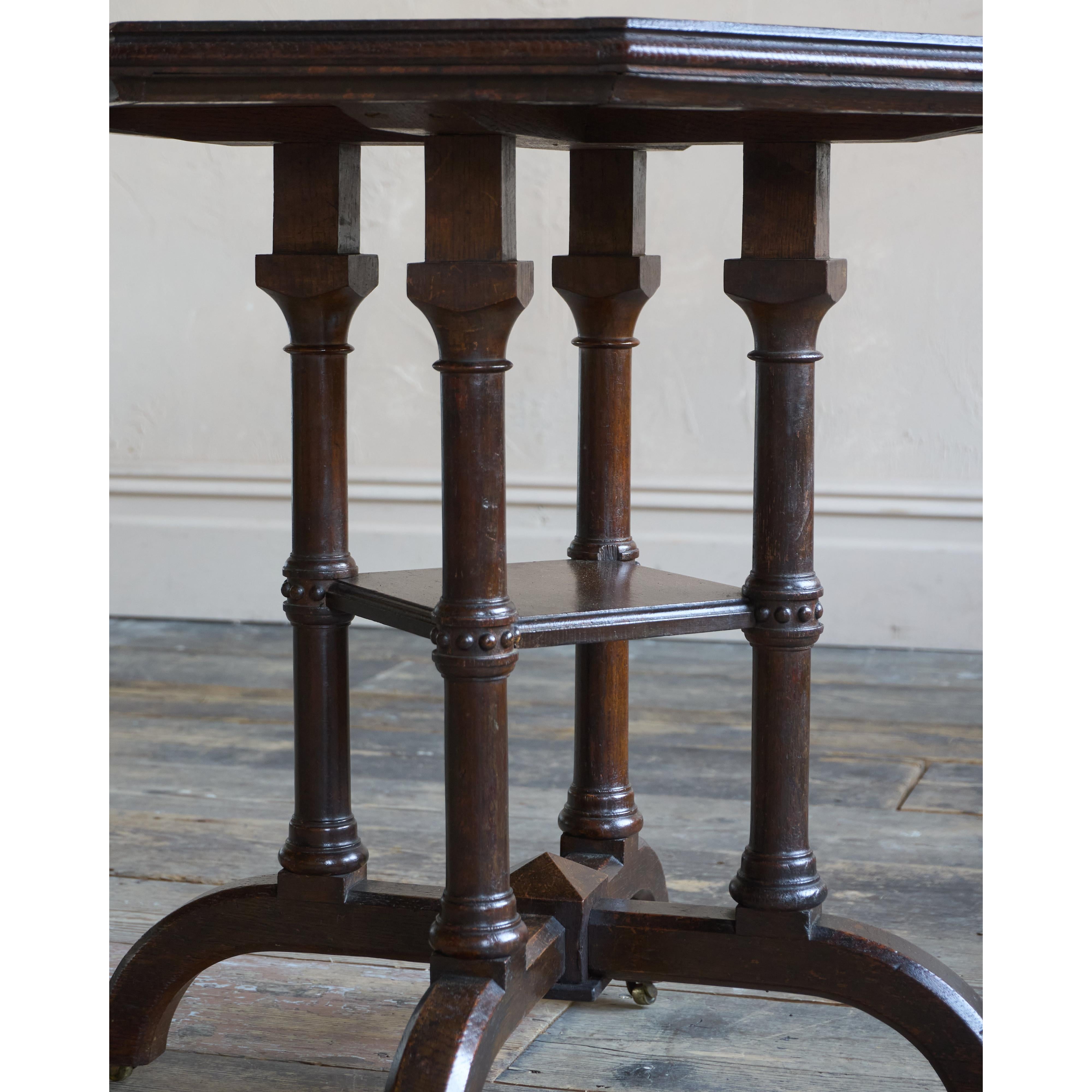 Solid english oak construction with an octagonal top and gothic like pillars and legs, with recessed Cope & Collinson castors.