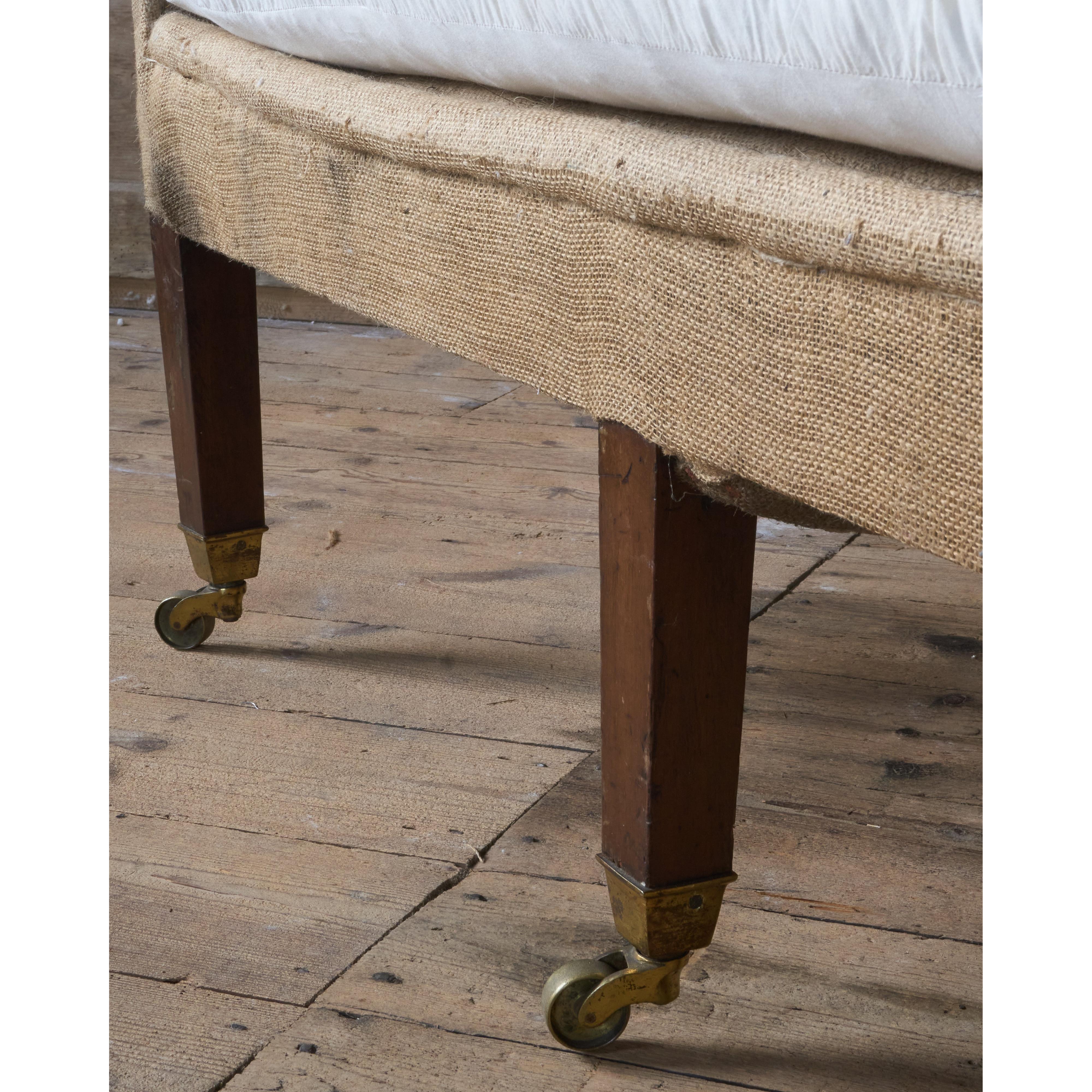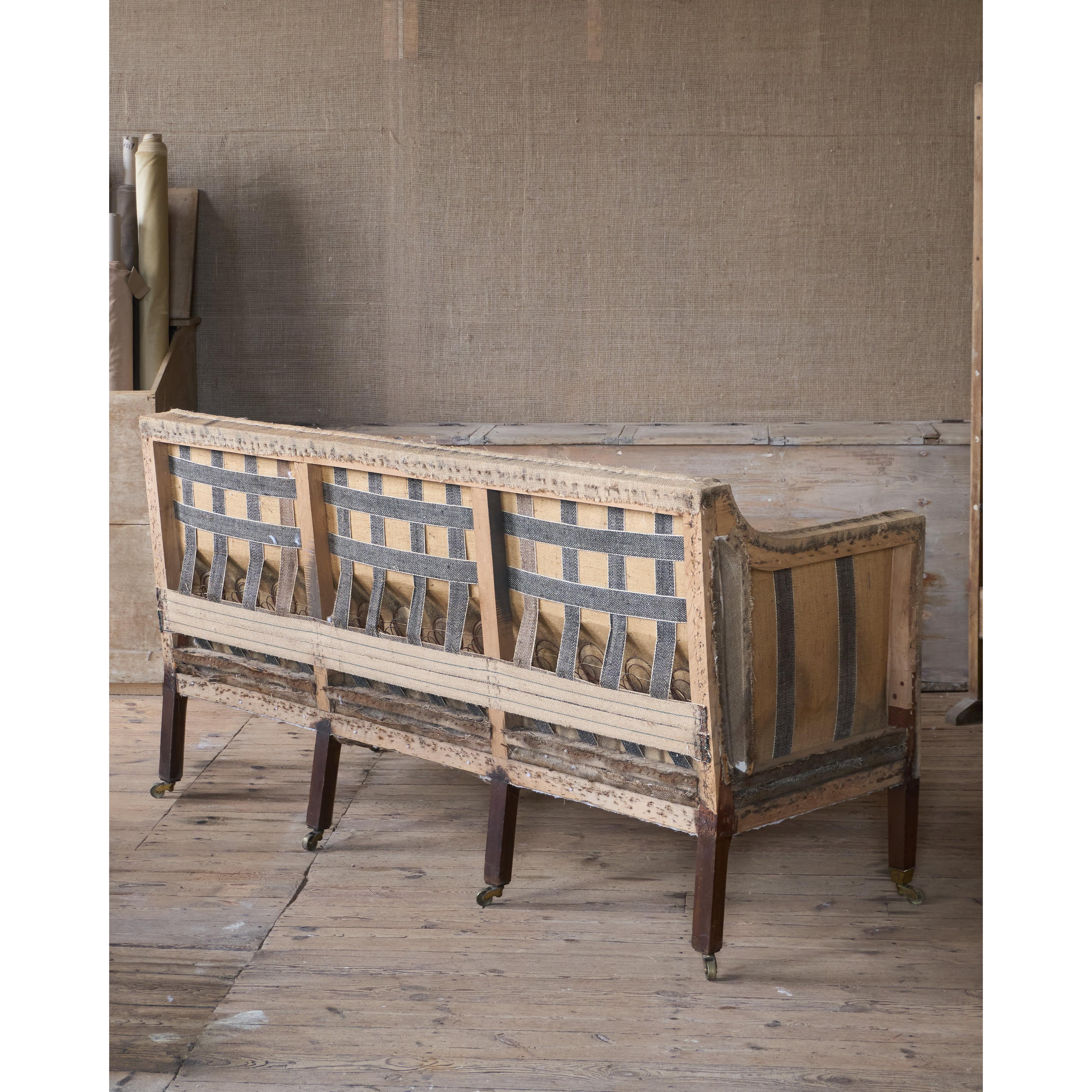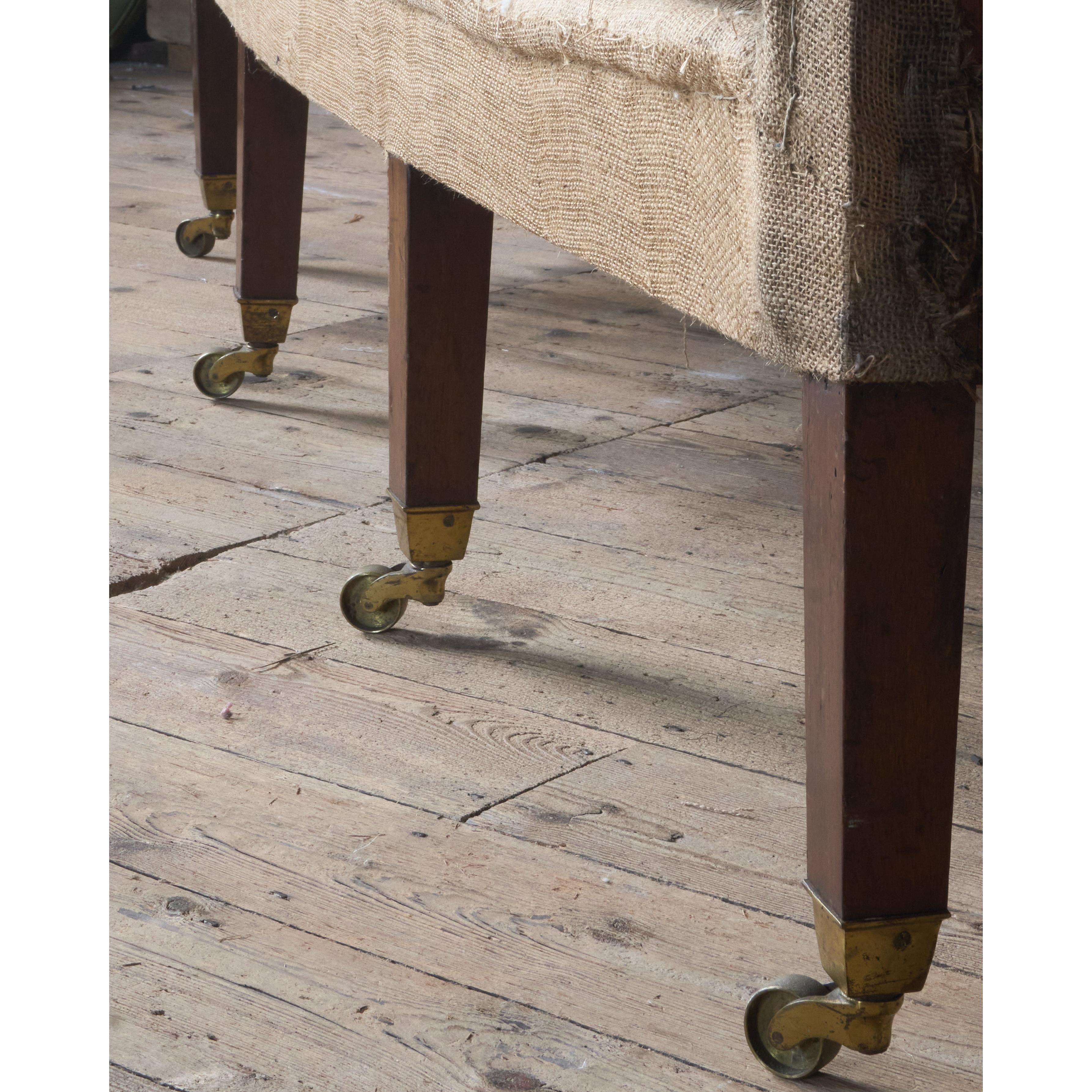 This country house 3-seater settee has an oak frame and mahogany legs which have the original brass castors.