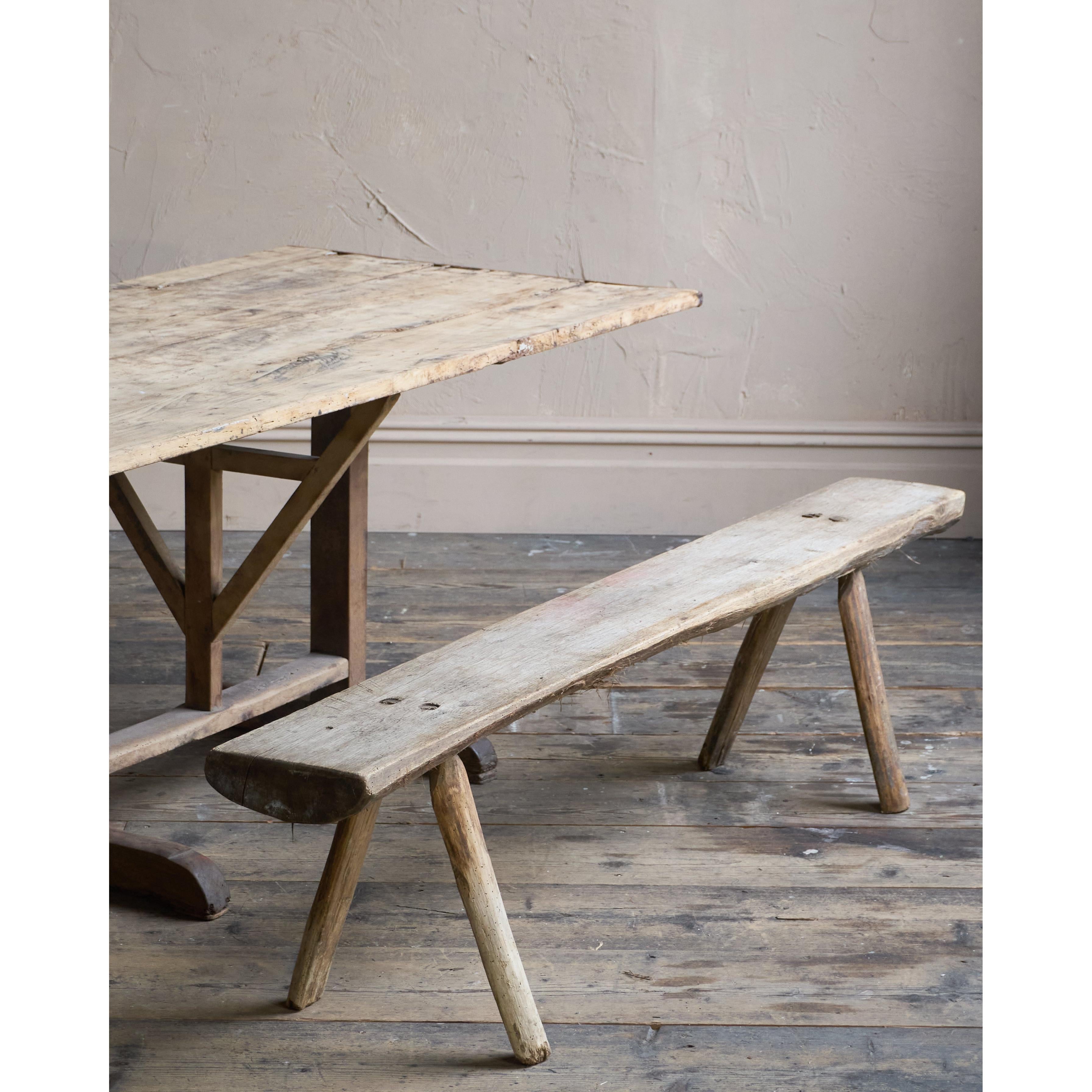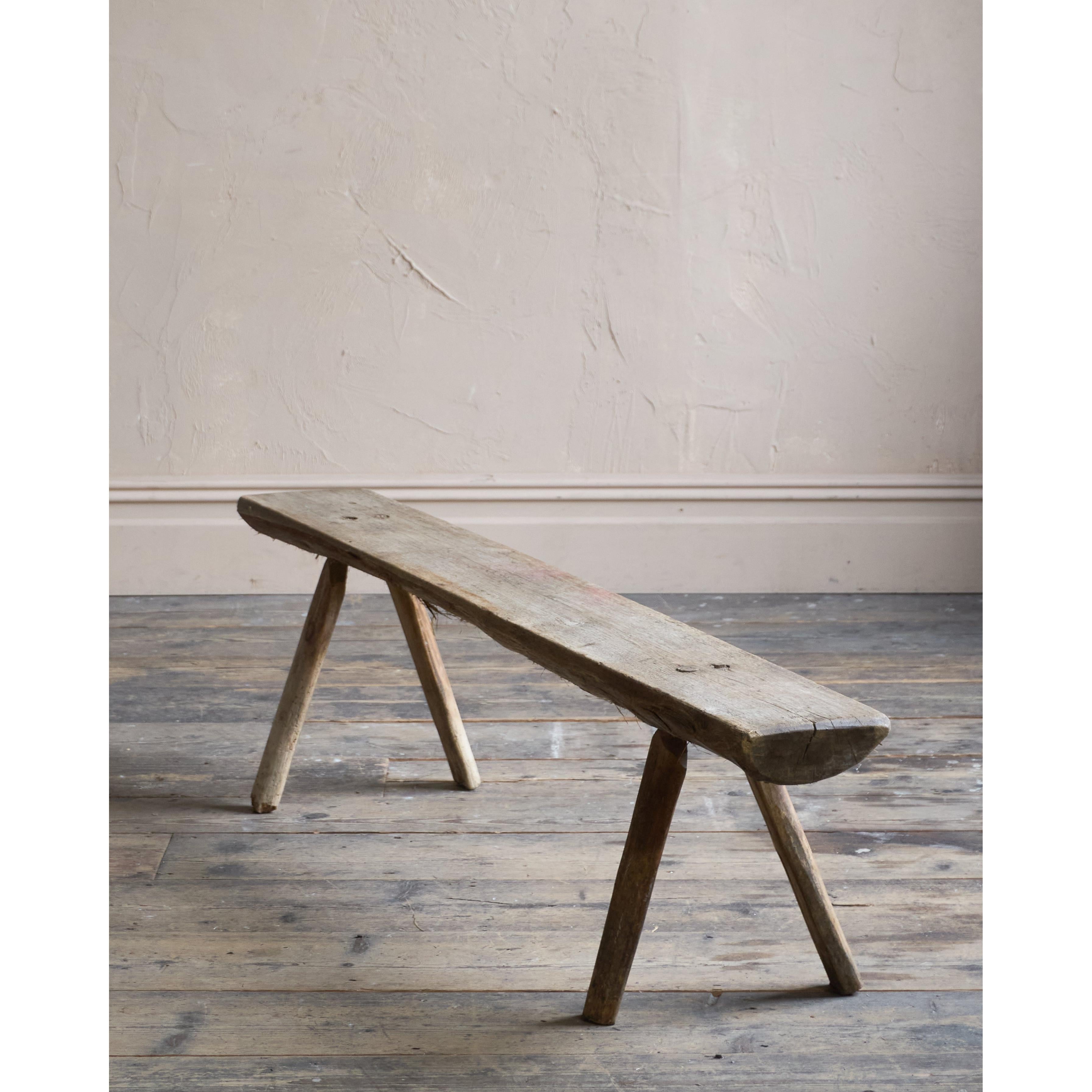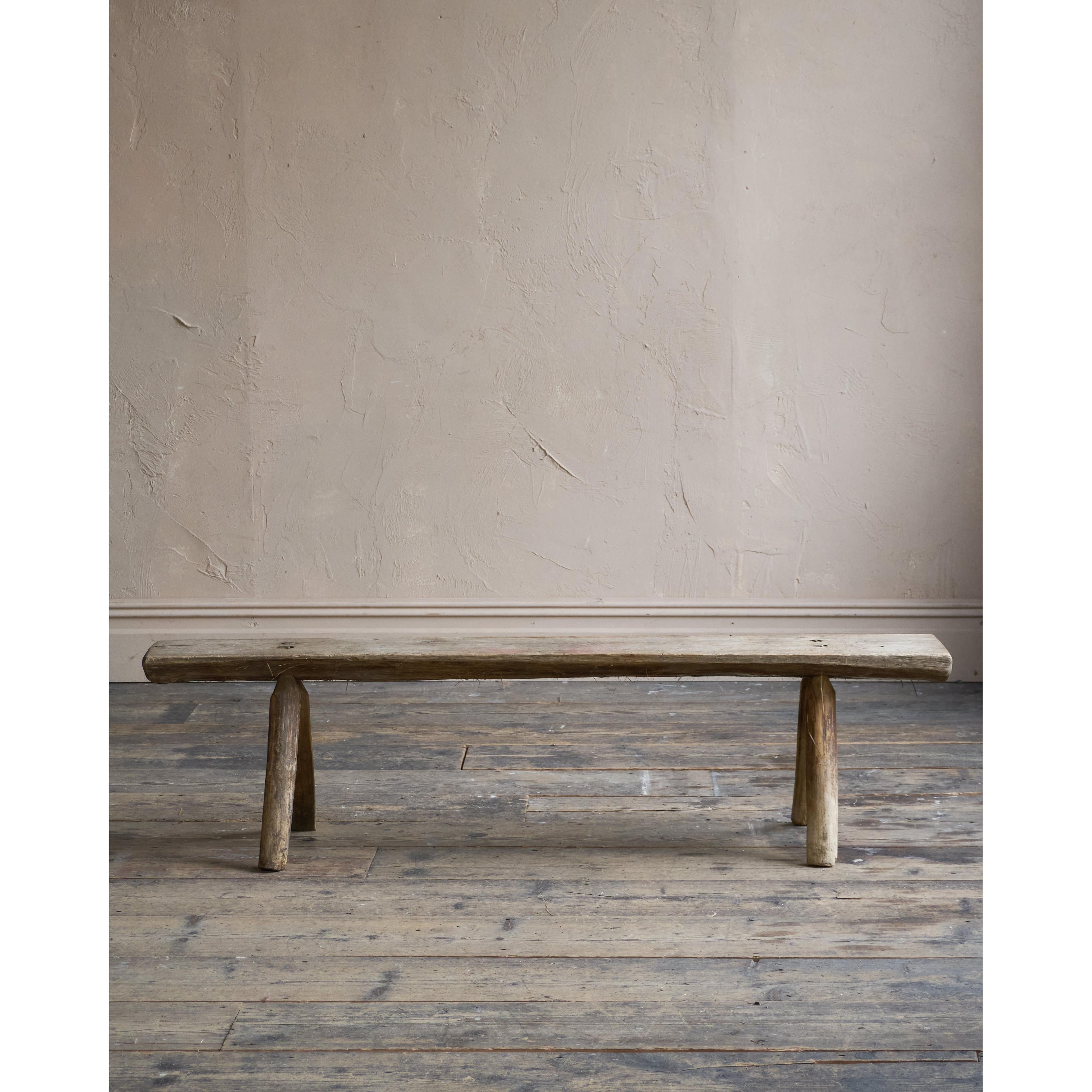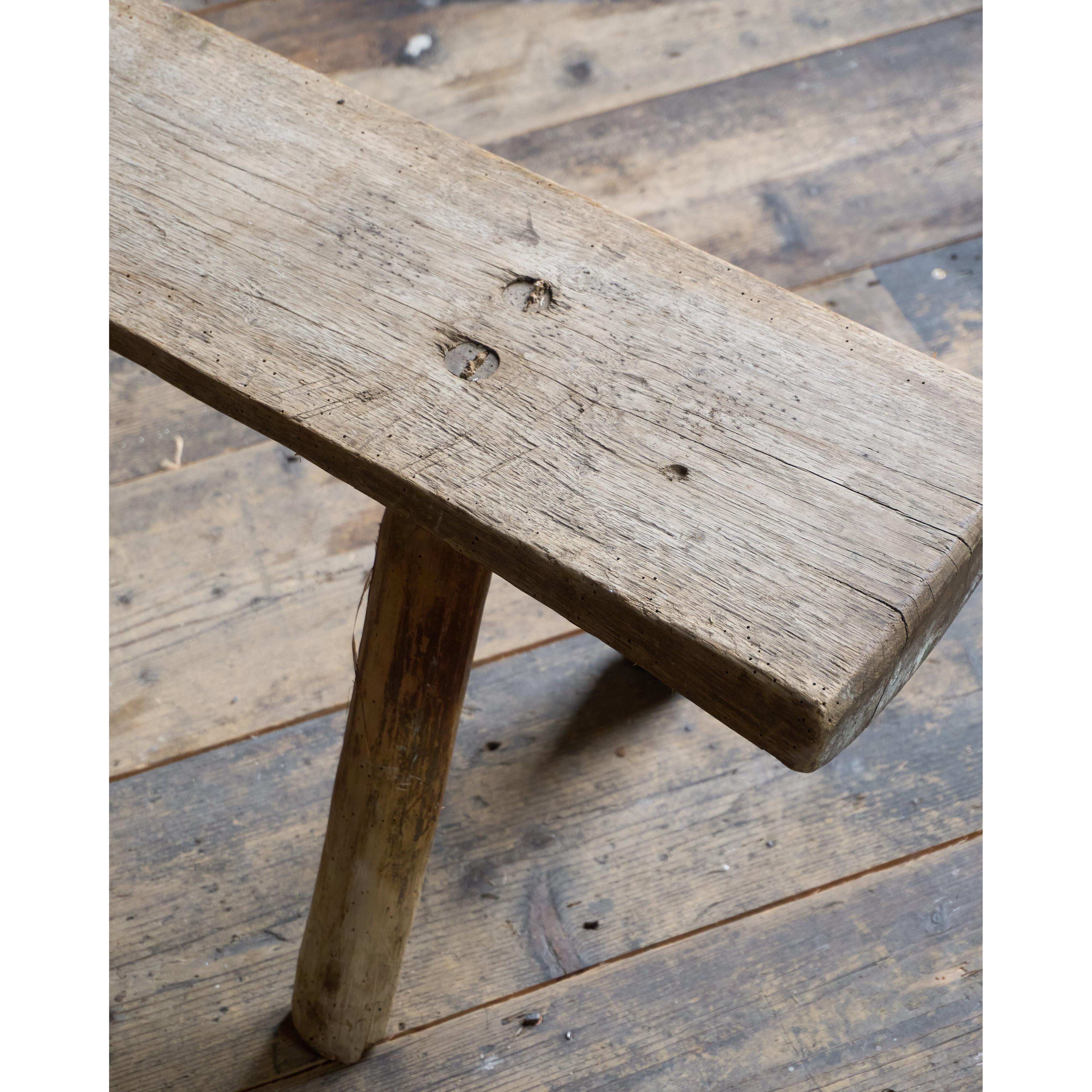 This rustic 1940s bench is made from a halved oak log with pine branch legs wedged in place.