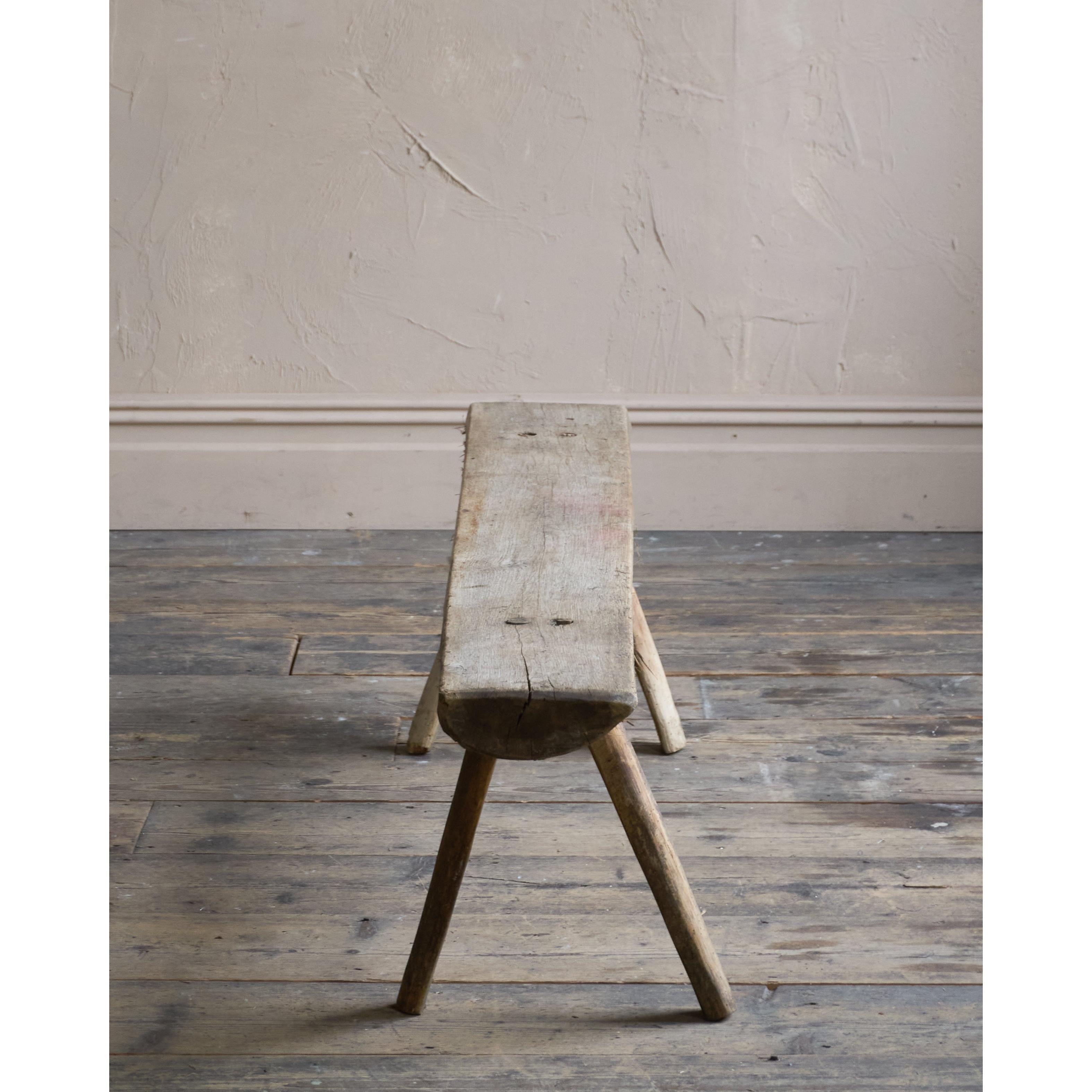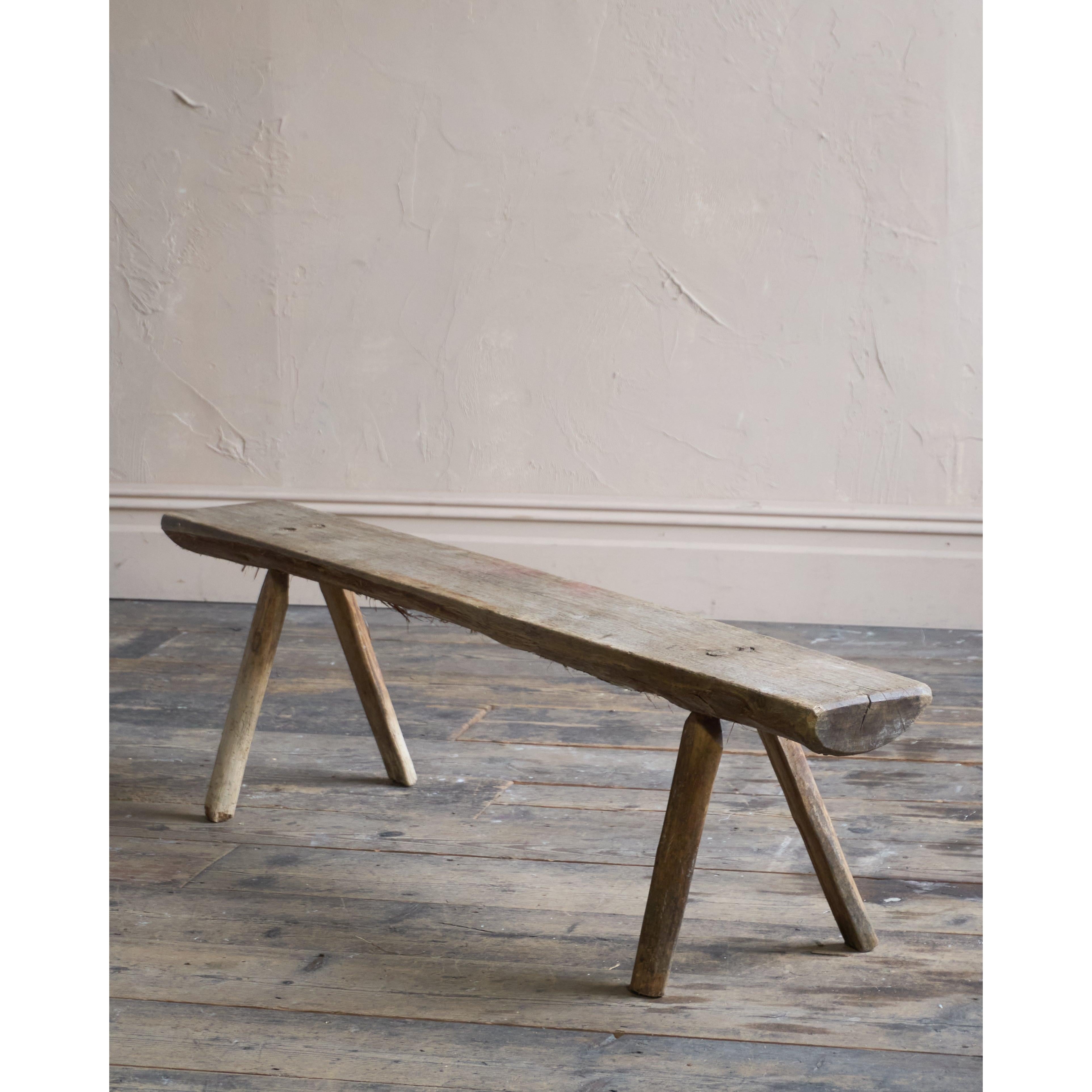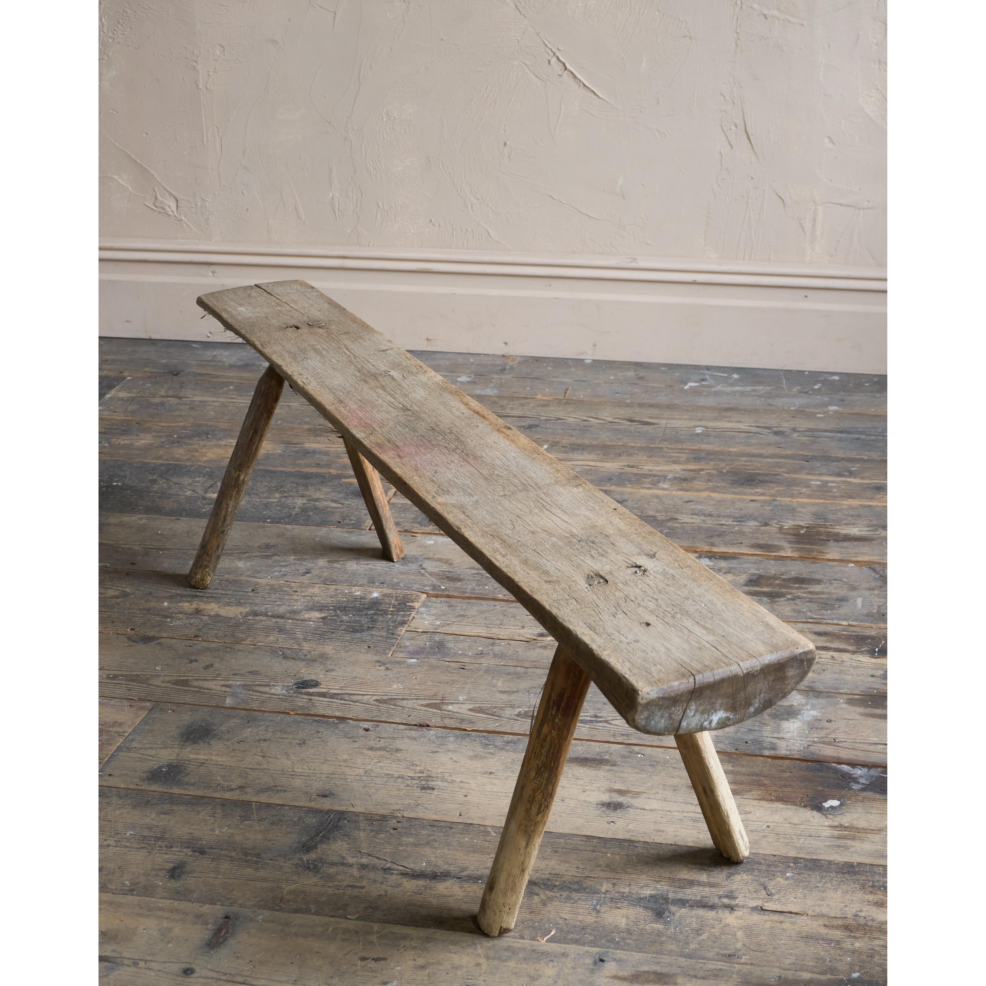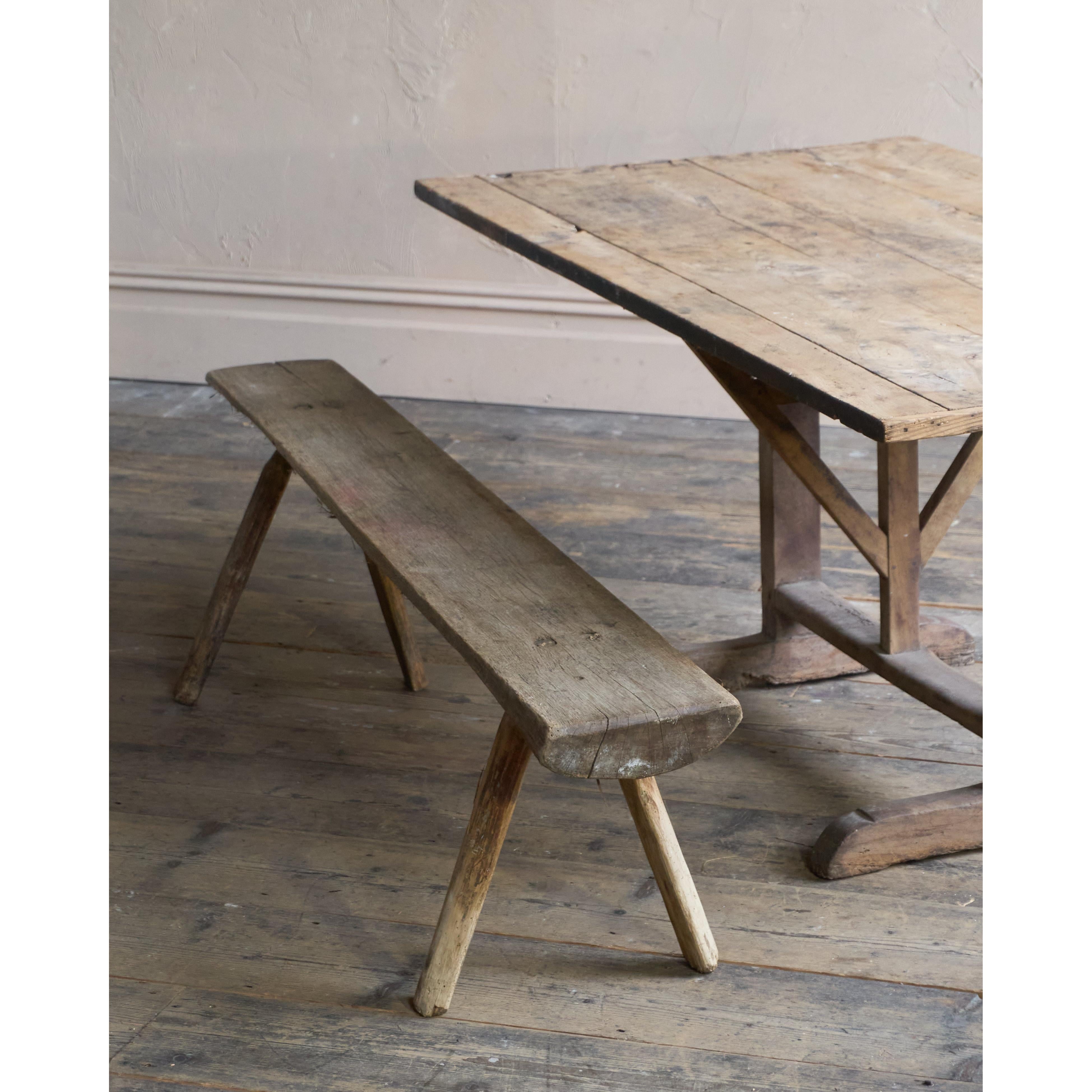 This rustic 1940s bench is made from a halved oak log with pine branch legs wedged in place.